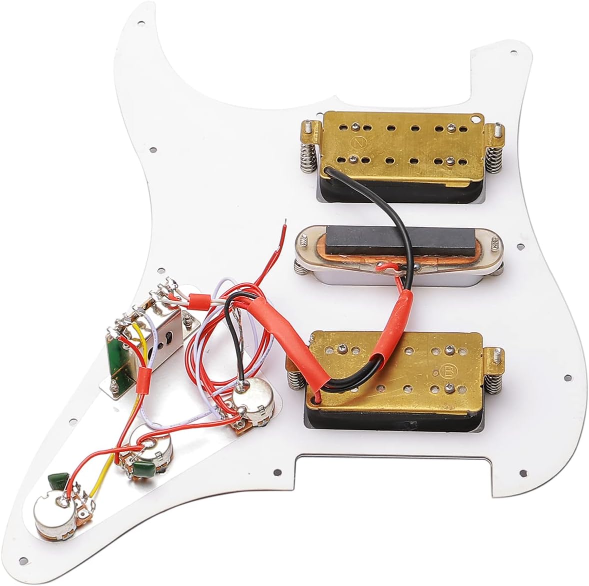 Specification Perfect replacement pickguard for your electric guitar 4-ply,11 mounting holes guard loaded, with 2 humbuckers and one single coil pickup,H-S-H configuration I cannot guarantee that the screw holes will line up with those on your guitar given the great variety of models on the market Package Includes: 1 x Loaded Pickguard HSH 20xblack screw 20xsilver screw 6 x Guitar Strings 1 x String winder 3 IN 1 1 x Screwdriver