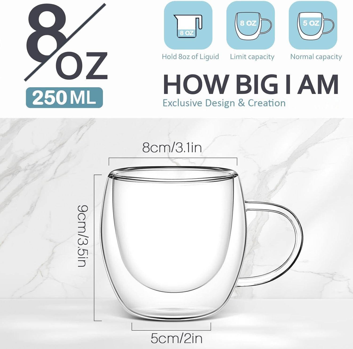 Features: Insulated glass maintains ideal temperatures longer, and design which can save you a lot of cleaning time. 8 Oz/ 250 ml is a proper size for daily application, you can use in many occasions. Specifications: Material: glass Color: clear Size: as shown in the picture Capacity: 8 oz Package includes: 12 x Glass coffee cups Notes: Hand wash only. Manual measurement, please allow slight errors on size. The color may exist a slight difference due to different screen displays