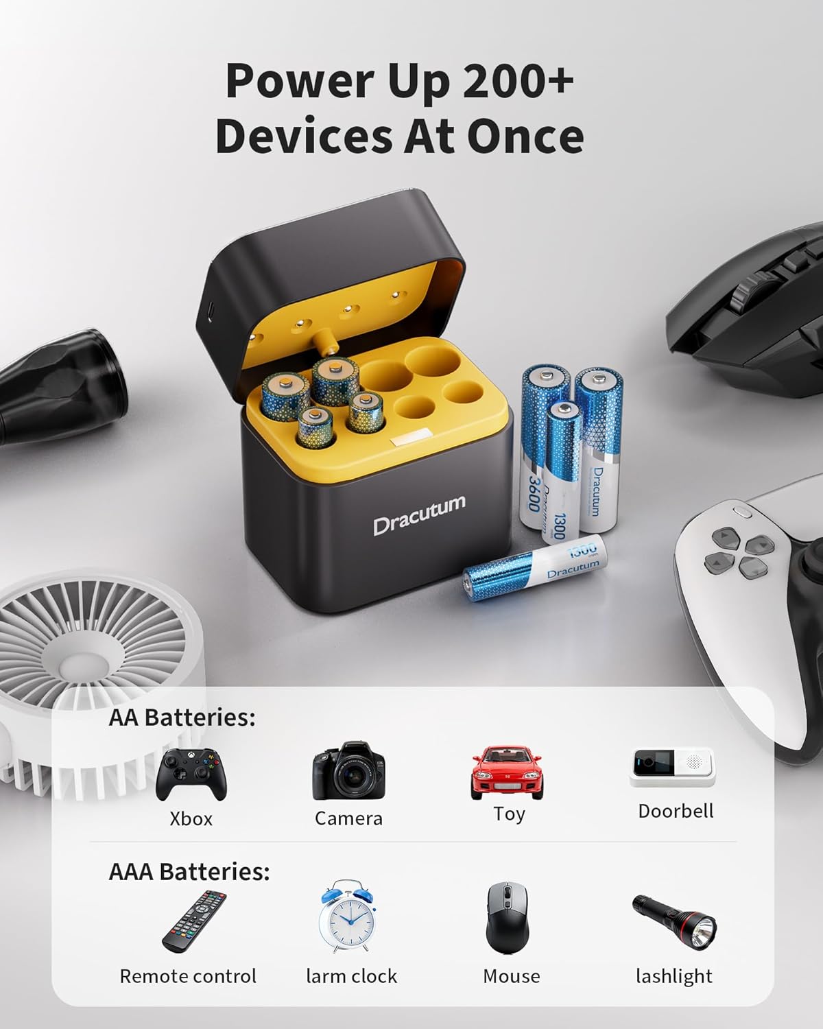 | BuiltIn Media | 4 AA Rechargeable Batteries, 4 AAA Rechargeable Batteries, Battery Charger x1, USB-C Cable |