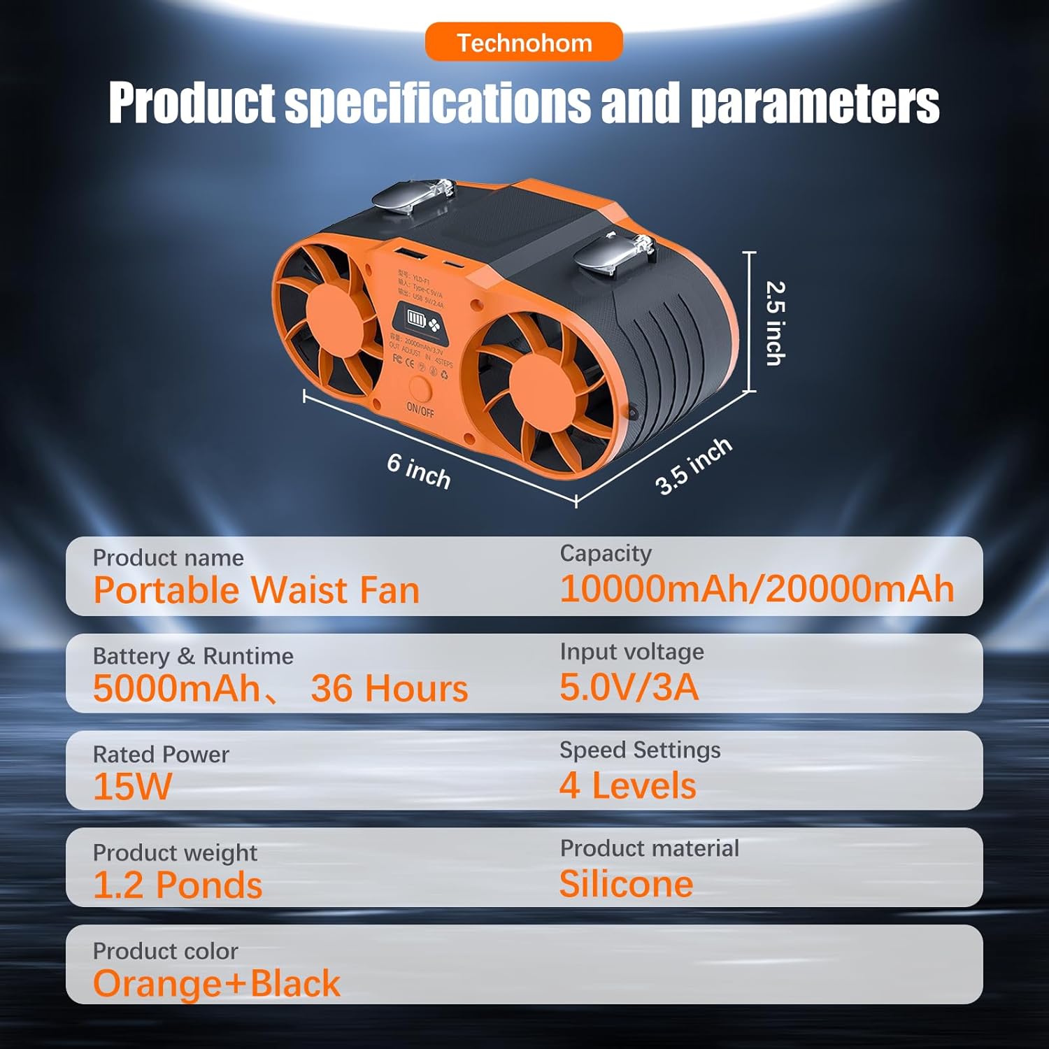 Stay cool and comfortable even in extreme outdoor conditions with the Technohom 20000mAh Portable Waist Fan — a cutting-edge cooling solution designed for outdoor workers, field technicians, delivery drivers, hikers, and anyone needing powerful, wearable airflow. Power That Lasts Thanks to its built-in dual-cell 20000mAh battery, this portable fan rechargeable unit delivers up to 38 hours of continuous breeze on low speed. Ideal for long workdays or outdoor adventures, it supports fast Type-C charging and also functions as a power bank — so you never run out of juice on your devices. Built for Performance The powerful brushless dual-motor system creates impressive airflow up to 14m/s, quickly cooling your entire body. Compared to many competitors that max out at 11–12 m/s or offer weaker RPMs, this belt fan clip on waist portable cooling fan provides next-level relief. Smarter Controls with LED Display Unlike fans that leave you guessing, our LED display shows you exactly how much power you have left and which speed setting is active. This simple yet essential feature solves a major user pain point — no more unexpected shut-offs during work or travel. Designed for Tough Use Made to clip onto belts, waistbands, or overalls, this waist clip fan stays securely in place thanks to its upgraded double clips and anti-drop structure. With only 290g in weight, it’s light enough for daily wear yet sturdy enough for rough environments like construction sites, farms, and garages. Versatile and Reliable Companion Not just for work – this waist fan is great for outdoor sports, camping, travel, gardening, yard chores, or even kitchen heat. The 4-speed adjustable airflow gives you personalized comfort, while the USB output keeps your devices powered wherever you go. Whether you’re braving the summer sun or working in high-heat conditions, the Technohom portable waist fan is the cooling solution that works as hard as you do.