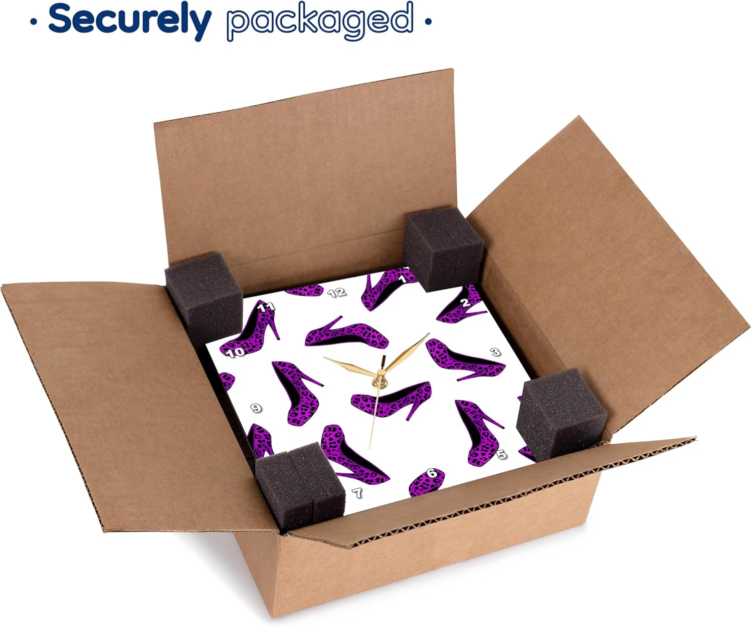 High Heel Shoes Print Purple Cheetah Wall Clock is a wonderful complement to any room in your home or office. Made of durable high grade aluminum. This frameless clock has a high gloss mirror like, UV coated, scratch resistant finish and is suitable for a moist environment. Measures 6" x 6" and requires one AA battery; not included. Battery box is not covered.