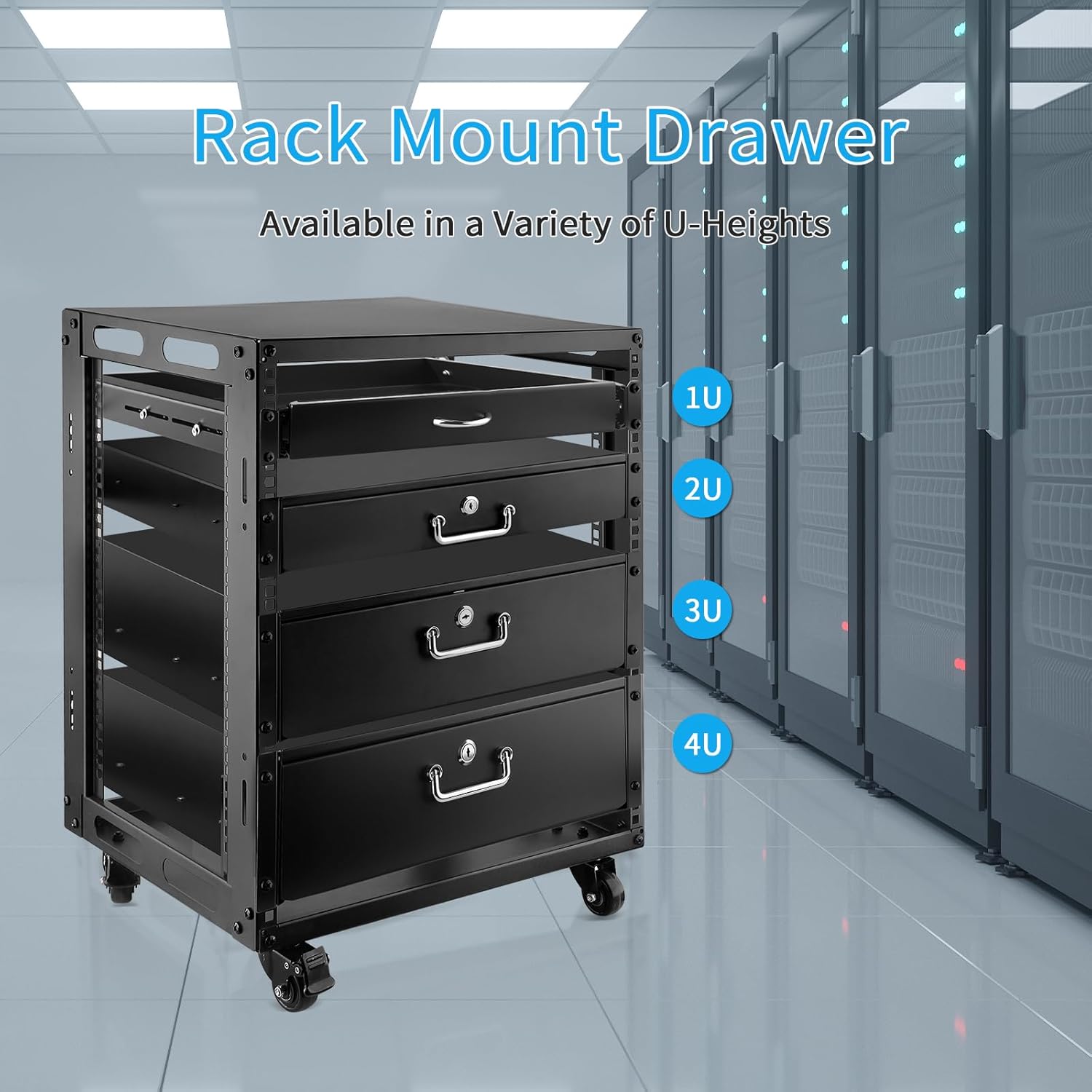 This 3U rack mount drawer is constructed from heavy-duty cold-rolled steel and features an electrostatic powder-coated finish, providing resistance against rust and corrosion. It offers ample storage space for various iteEasy Installation: The package includes mounting hardware for a quick and hassle-free installation process.ms.