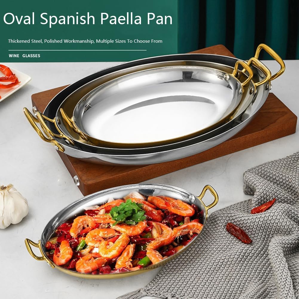 Authentic paella pans, a must-have for every paella fan. Bring your family and friends together, and celebrate over a delectable paella, enhanced by this special paella dish that serves up to 2-6 people. Made from high-quality stainless steel, this small paella pan is built to withstand heavy-duty use and includes sturdy riveted handles for a comfortable grip while cooking. This Oval Spanish Paella Pan is easy to clean after use, simply clean the parts with soap water or put them into dishwasher. This paella pan is suitable for wood fires, gas, oven, induction and gas burners. This Seafood Lobster Plate can be used to cook a variety of dishes, such as stir-fries, risottos, fajitas, and more. Specifications: Type: Spanish Paella Pan Material: StainlessSteel Color: Silver, Gold, Rose Gold Size: 4 Sizes, 25.5cm, 30cm, 36cm, 40cm Can Choose Feature: Non Stick, Uncoated, Dishwasher-Safe Application: Home, Kitchen, Restaurent, Party, Outdoor, Camping Package List: 1 x Spanish Paella Pan