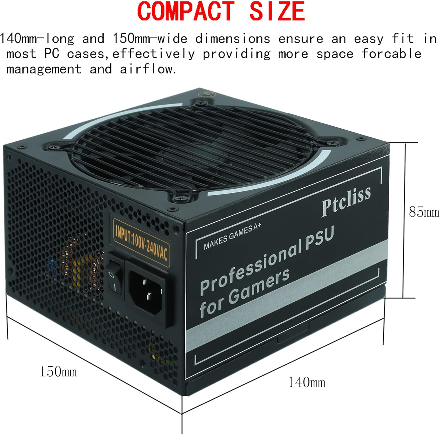 Ptcliss 550W GD550S ATX Gaming PC Power Supply 80+ Bronze PSU Non-Modular Power Supply Flat Black Cables 550watt non-modular ATX gaming pc power supply80 PLUS Bronze , with 85% efficiency or higher under typical loads 20mm ultra quiet fan ,excellent cooling performance,RGB LED Fan displaying7 colors Heavy-duty protection including: Over Voltage Protection(OVP),Under Voltage Protection(UVP),Over Power Protection(OPP)and Short Circuit Protection(SCP)Over Current Protection Connector:24(20+4)Pin x 1,ATX 12V 4+4 Pin x 2,PCI-E 6+2 Pin x 1, Molex x 3 ,SATA4PIN x 4 br>1, the picture is taken in kind, 2, please carefully confirm the power supply and part number and model before purchase.3. Each power supply is tested before shipment4, If you have any questions, please feel free to contact us, we will be happy to help you.