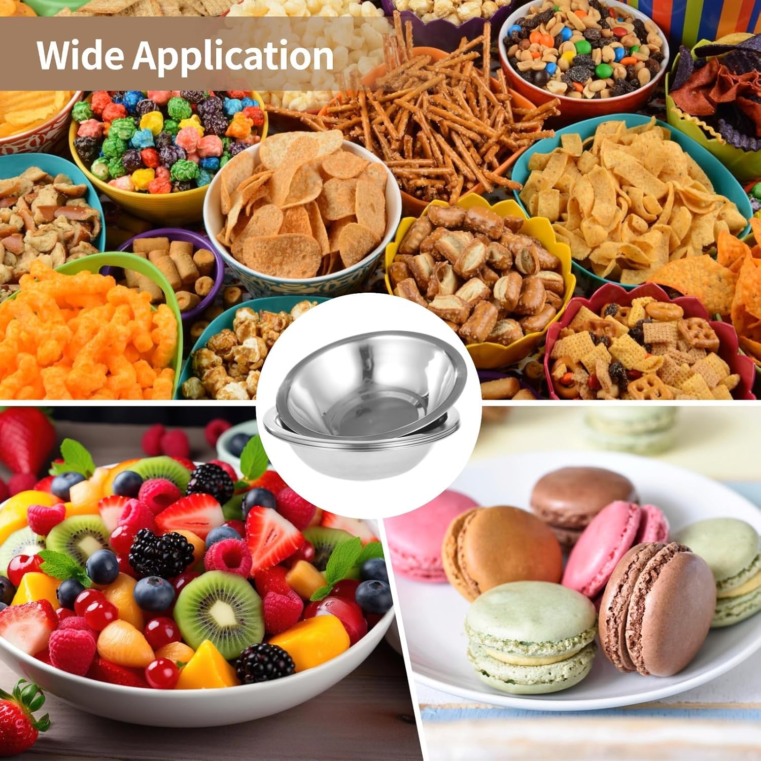 Color:silver Material:Stainless steel Product Size: diameter: 6.3 inches Package Includes:stainless steel bowls x 30 Note: - Please refer to the measurement. Tiny measuring error is allowable in normal range. - There might be a little color difference due to the monitor, camera or other factors, please refer to the physical item.