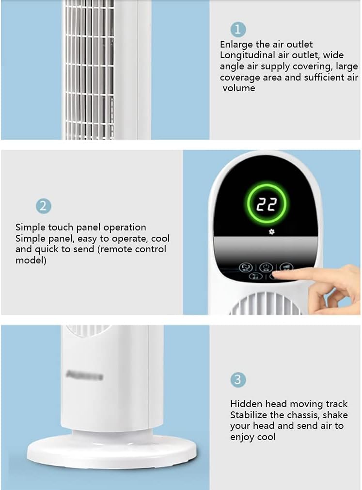 Product Name: Tower Fan Gear position: 3 Positive mode: Normal/Natural/Sleep Angle: 80° left and right Power: 45W Height: 820mm Timing: 9 hours Screen: real-time temperature display Cable length: 1.6m Noise: ≤65db(a) Weight: 2.6kg