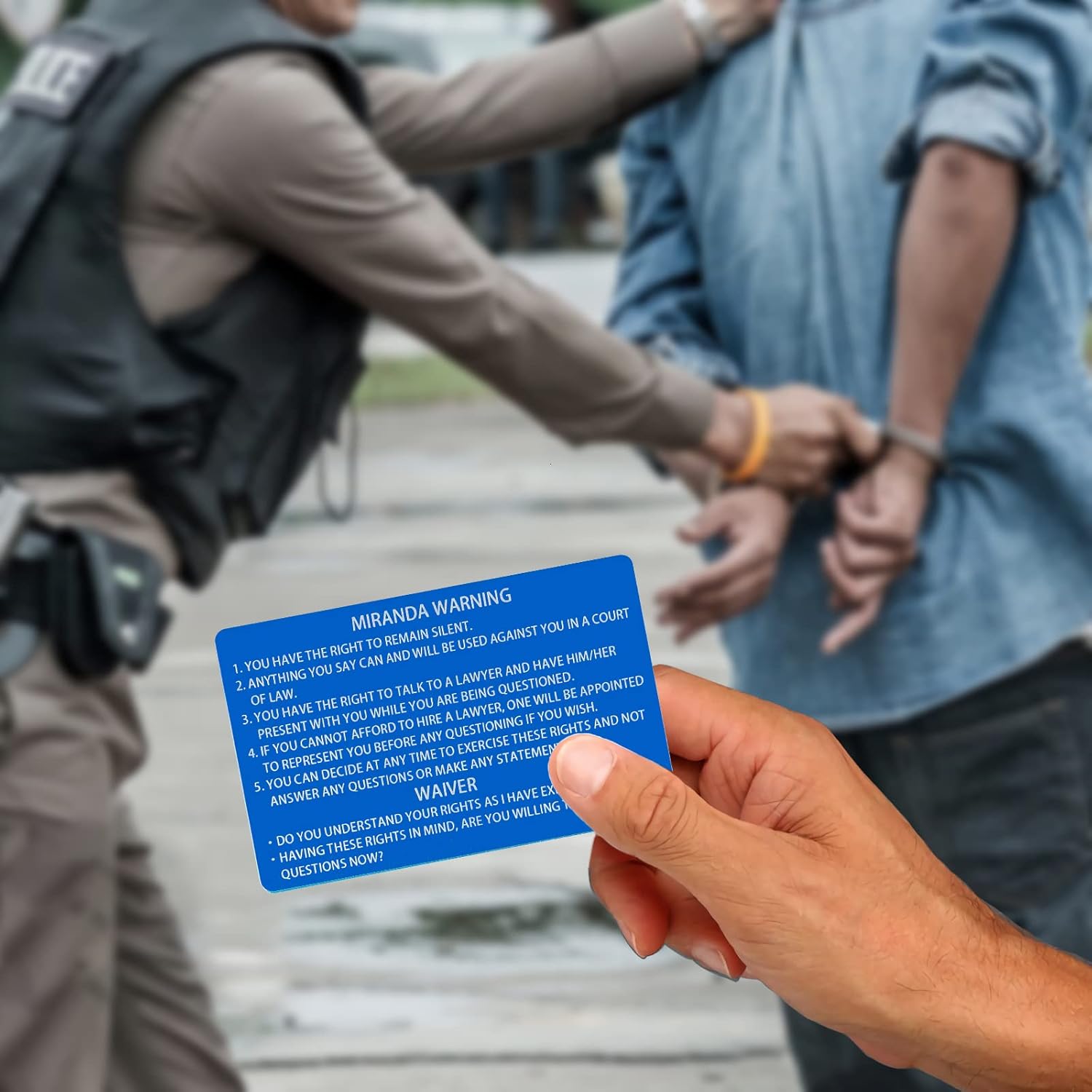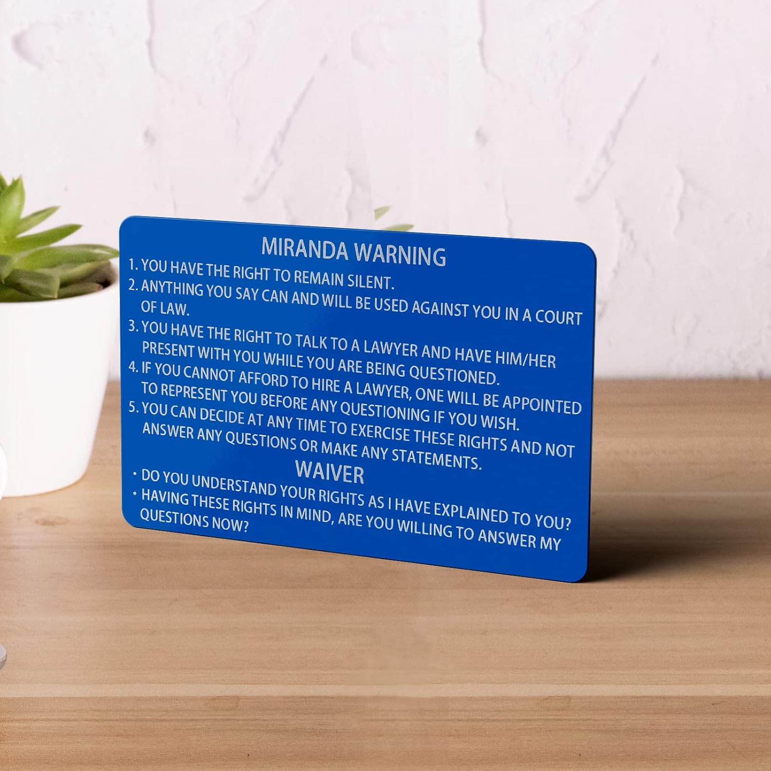 Features: 12 PCS Blue Metal Miranda Warning Card,Easy to Carry and Use. Material: Aluminium alloy. Benefit: A quick and accurate way for officers to read miranda warnings, make the work efficiently.