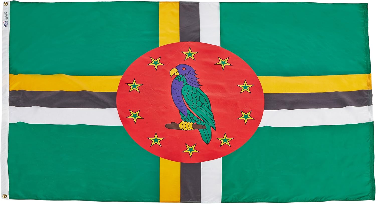 Adopted in 1978, the flag of Dominica consists of a green field representing the lush vegetation of the island, and a three colored cross (made up of yellow, white, and black stripes) representing the Trinity and the Christian faith – its three colors recall the native Indians, the fertile soil, and the pure water. Charged at the center is a coat of arms which features the national bird emblem, and ten stars standing for the ten parishes. Family owned for over 175 years, Annin Flagmakers takes special pride in producing high-quality, American-made state, international, and military flags. All Annin Flagmakers flags are sewn in either South Boston, VA or Coshocton, OH. Our superior quality is time-tested and meets the requirements of the most discerning buyer. Nyl-Glo, Tough-Tex and Bulldog are registered trademarks and manufactured exclusively by Annin Flagmakers.