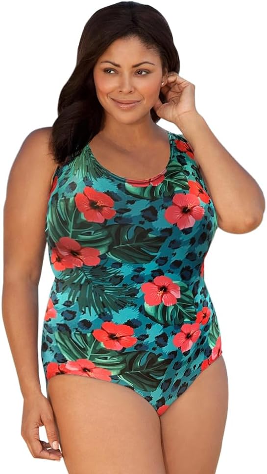 This Aquamore fully lined, high neck Plus Size swimsuit features our Signature Textured fabric offering flattering stretch and support. The suit also features a scoop back design, soft cup bra with superior wrap around support, and moderate fitness leg line. Great for water fitness and lap swimming!