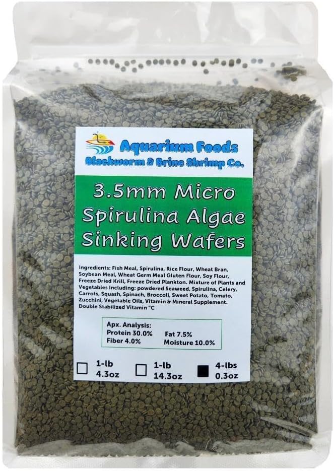 Aquatic Foods & Blackworm Co. 3.5mm - 1/8" Micro Spirulina Algae Sinking WafersFeeding Instruction:Lightly feed 2-4 times a day, feed only what your fish can consume within 5 minutes. Remove any remaining food to avoid polluting the water.Ingredients:Fish Meal, Spirulina, Rice Flour, Algae Meal, Wheat Bran, Soybean Meal, Wheat Germ Meal, Gluten Flour, Soy Flour, Freeze Dried Krill, Freeze Dried Plankton. Mixture of Plants and Vegetables Including: Powdered Seaweed, Spirulina, Celery, Carrots, Squash, Spinach, Broccoli, Sweet Potato, Tomato, Zucchini, Vegetable Oils, Vitamin & Mineral Supplement. Double Stabilized Vitamin “C”Apx Analysis:Min. Protein 30.0%Min. Fat 7.5%Max. Fiber 4.0%Max. Moisture 10.0%