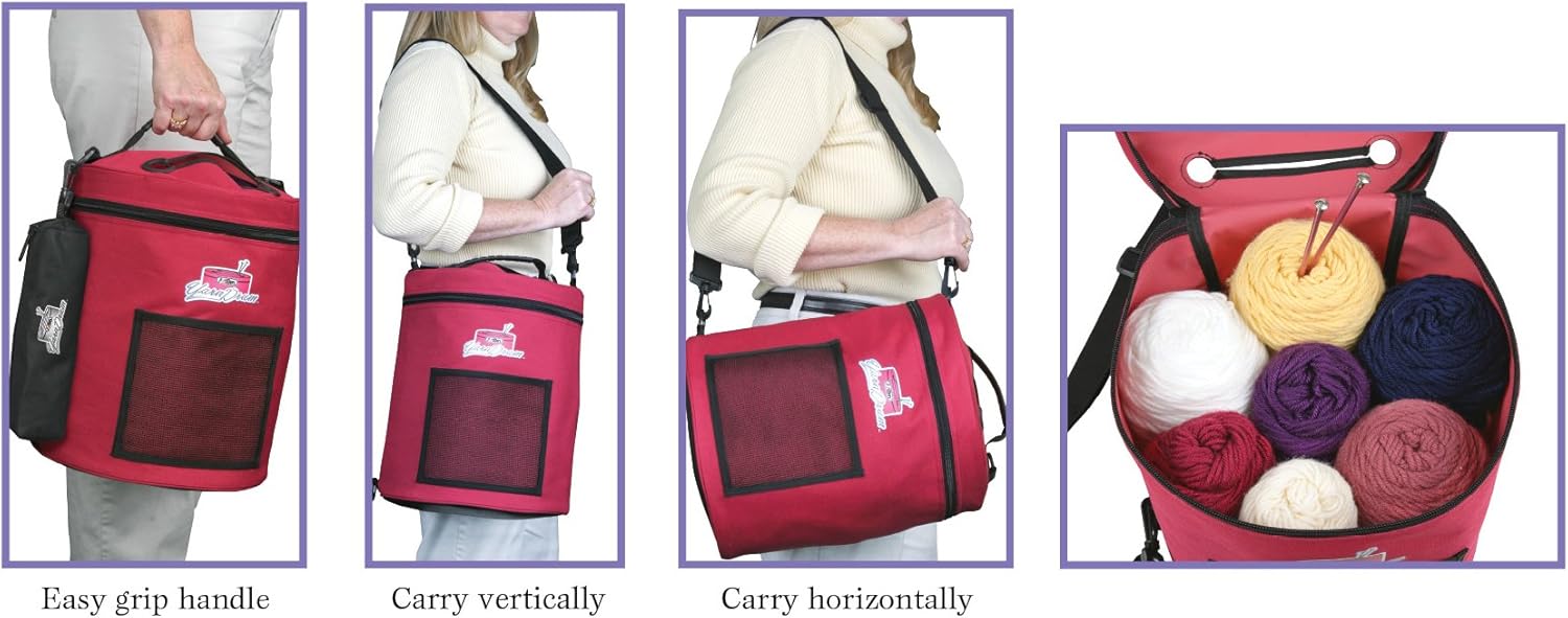 This lightweight tote holds up to eight standard sized skeins of yarn. Yarn in use can easily be removed from tote through lid. Textured PVC base keeps contents dry on wet surfaces. Tote can be carried three ways: easy grip handle or shoulder strap to carry horizontally or vertically. Accessory pouch stores small supplies and the mesh pocket is perfect for patterns and books. Tote measures 13 by 10-1/2 by 10-1/2 inches, pouch measures 3 by 8 by 3 inches. Imported.