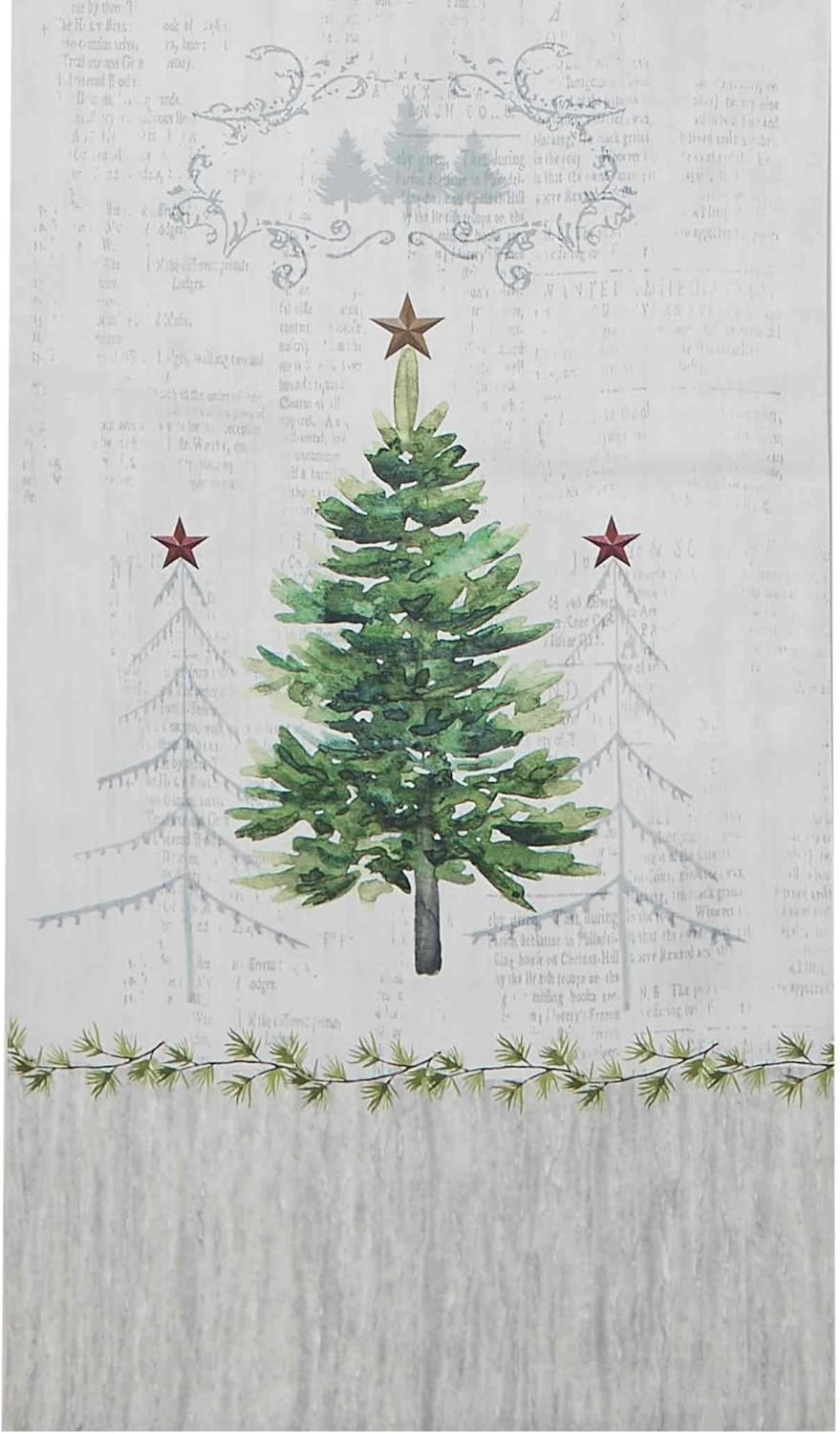 The Avanti Trees 14" x 72" Holiday Runner features a festive design with 2 opposing pine trees with stars at either end with pine branch borders below. The ground is off-white and linen with grey highlights throughout. Printed on 100% polyester for easy care and brilliant color.