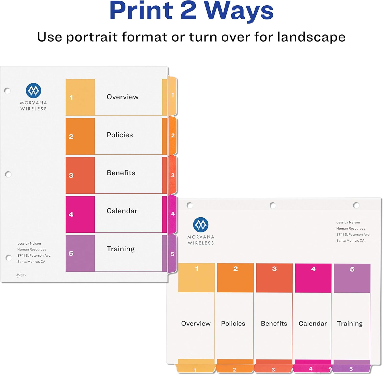 Organize your projects in moments with Avery Ready Index 5-tab dividers. Each tab is preprinted and uniquely color coded for a professional appearance. Print your own custom section titles and images onto the table of contents sheet without worrying about labels or inserts. Whether you're creating planners for classes or hosting a presentation, these dividers are ideal for getting everything sorted. 24 sets of 5 tabbed dividers are included with each sheet measuring 8-1/2"x11". The heavyweight sheets feature durable, reinforced 3 ring binder holes to help prevent tearing. Each divider tab includes additional reinforcement along the edge of each page to distribute stress and resist folding. The printable table of contents is dual compatible with both laser and inkjet printers. This sheet can also be printed in either portrait or landscape so that your projects can be displayed in any orientation. Just flip the sheet to view the other layout on the opposite side. Check out Avery Design & Print software today and use the available Avery templates to easily personalize your binder dividers.