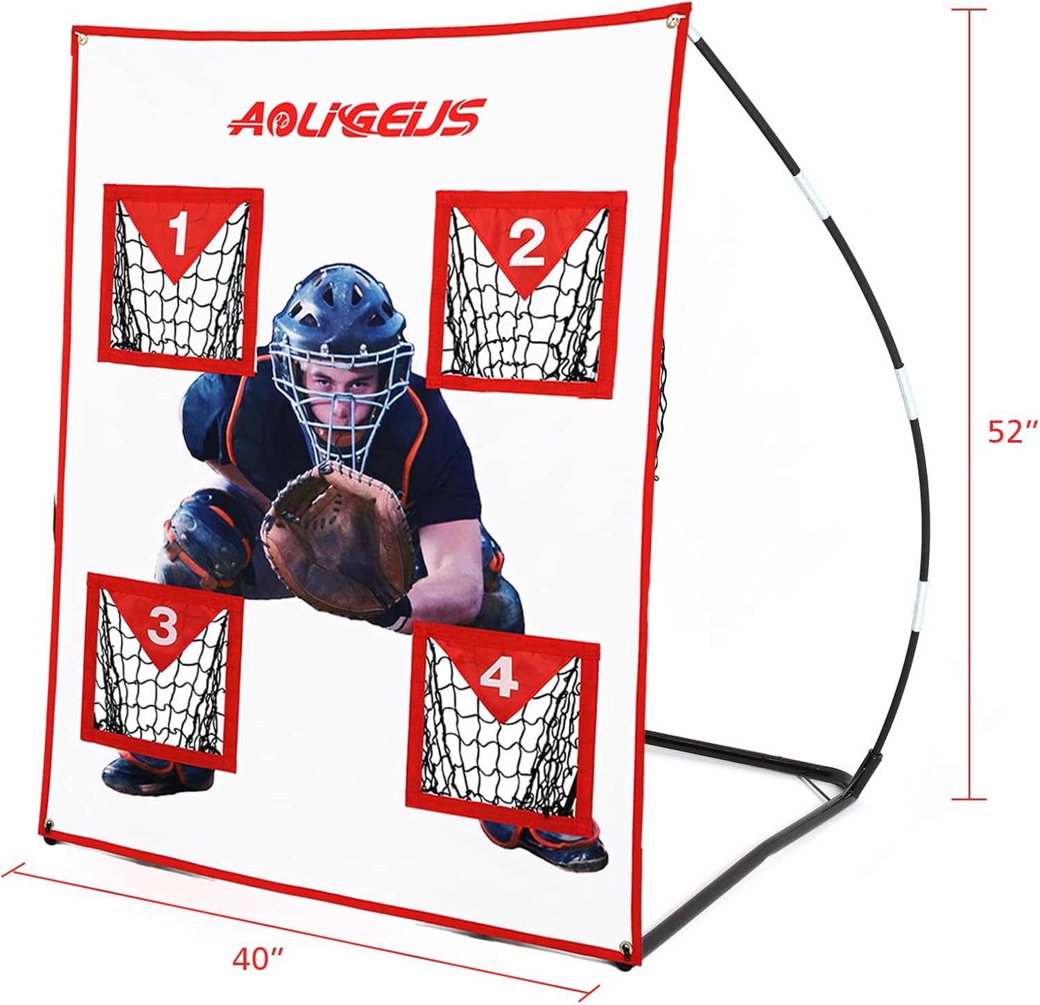 AOLIGEIJS Baseball & Softball Pitching Target Net,Realistic catcher simulates a live Catcher for safe and effective pitching drills, which improves the accuracy of the pitcher's throws while avoiding injury to the actual catcher.The 4 quadrant digitally labelled pocket pitches allow pitchers to visualise where they want to finish their pitches; the netted pockets that catch any ball thrown through each quadrant. It is great for all ages.