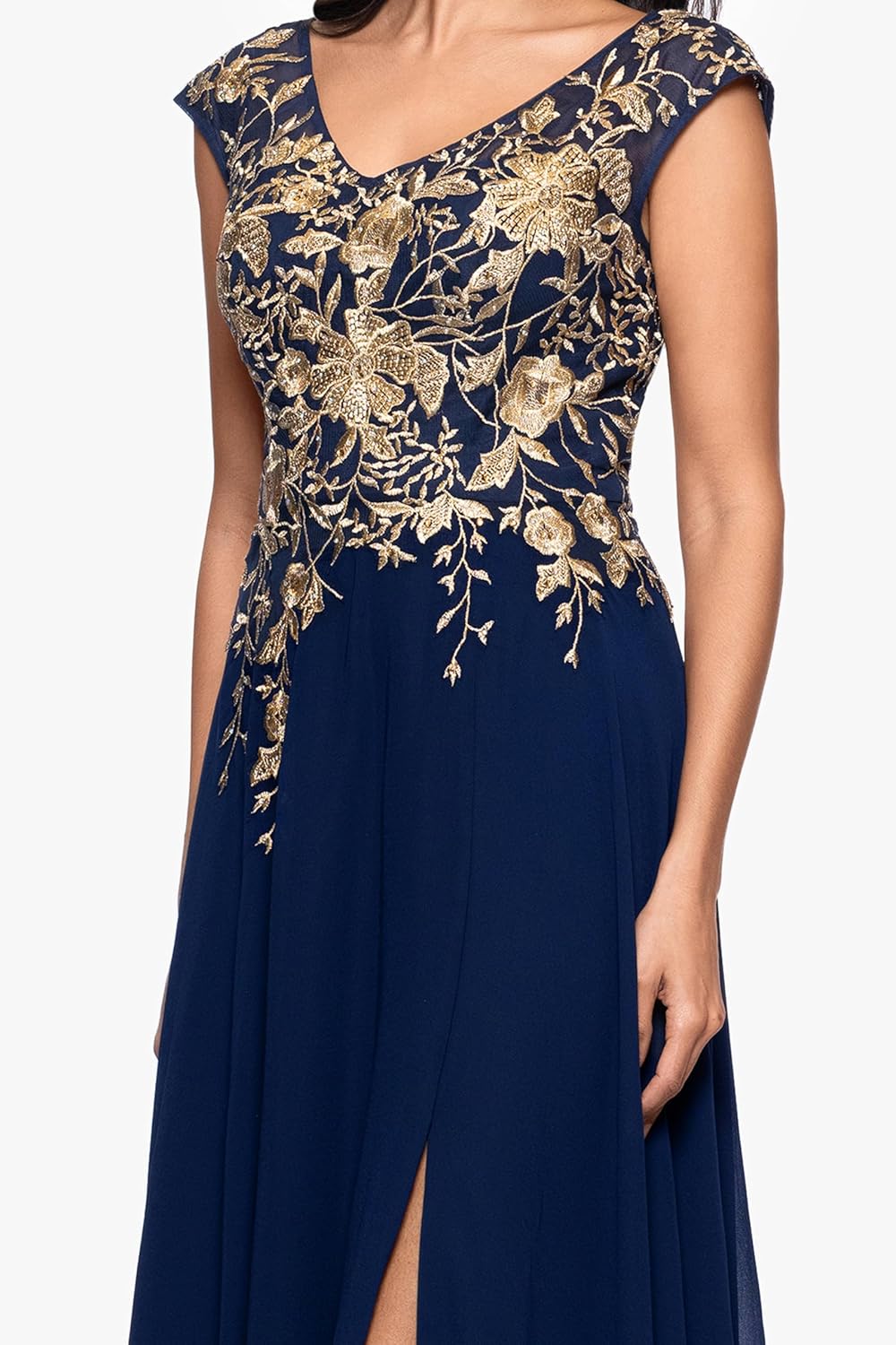 Betsy & Adam chiffon dress with V-neckline, embroidered floral bodice, and delicate cap sleeves. Floor-length A-line skirt with flowing silhouette and back zip closure, perfect for weddings, galas, evening parties, and elegant black-tie occasions.
