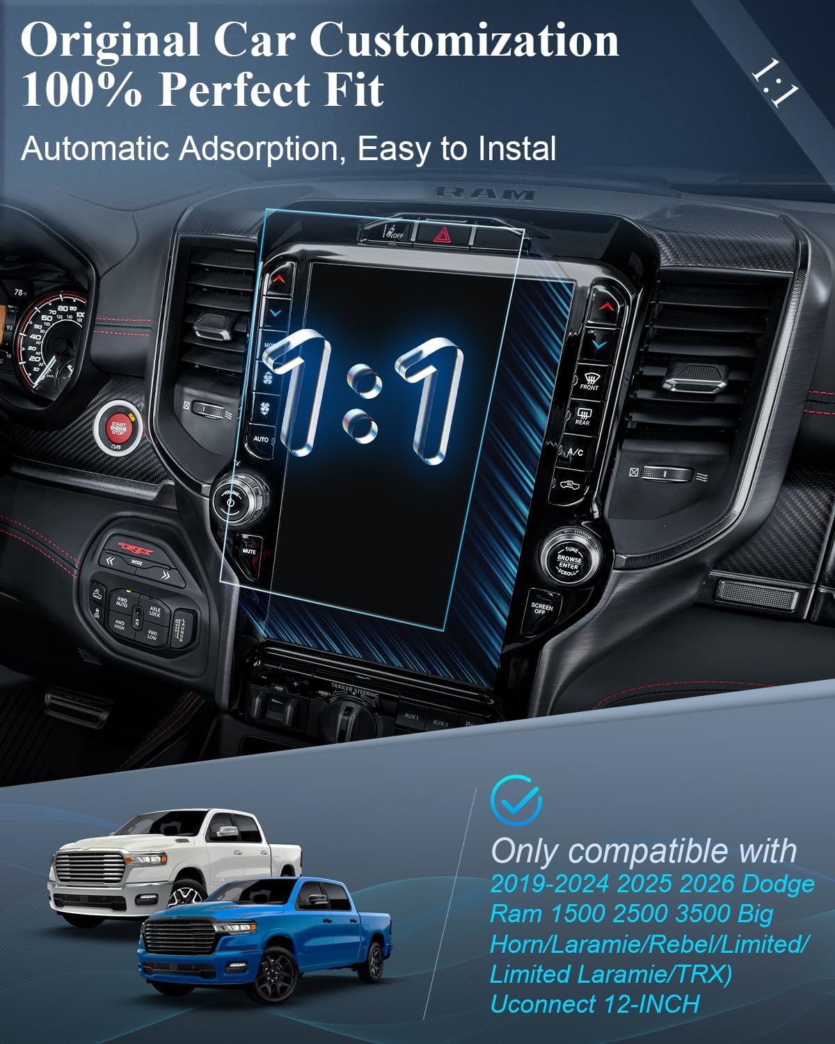 Compatible with: 2019-2026 Ram 1500 Uconnect 12-inch Touchscreen,2019-2026 Ram 2500 Uconnect 12-inch Touchscreen,2019-2026 Ram 3500 Uconnect 12-inch TouchscreenCore Functions1.Scratch-ResistantProtects your screen from everyday scratches from keys, dust, and sand2.Shatterproof / Impact ProtectionIf impacted, the protector will crack instead of your screen, holding glass fragments together3.High Definition / Crystal ClearMaintains the original screen clarity and color accuracy without distortion4.Anti-Glare / Matte FinishDiffuses ambient light to lowers reflections and eye strain5.Oleophobic & Hydrophobic CoatingMaking the screen easier to clean6.Smooth TouchProvides a silky like feel for effortless swiping and scrolling7.Easy InstallationIncludes a complete kit bubble-free installation8.Fingerprint-ResistantFeatures an oleophobic coating that repels oilPackage Included:2x Matte Screen Protector2x Installation Tool Kits1x User's GuideInstallation Steps:1.Compare the protector with your navigation screen2.Clean the screen: Open the tool kits,Use the wet wipe to clean firstly,then use the micro fiber cloth to clean again.2.Use the dust removal sticker to eliminate the surface dust to ensure the screen totally clean.3.Use the positioning labels to align the protector on the screen. Ensure that the position of the protector is correct.4.Tear off the back of the protective film clockwise, gently use the micro fiber cloth to clean the screen,then install swipe from the center of the screen and wait for the protector to adsorb automatically.5.Use the micro fiber cloth to clean the screen ,then install finished