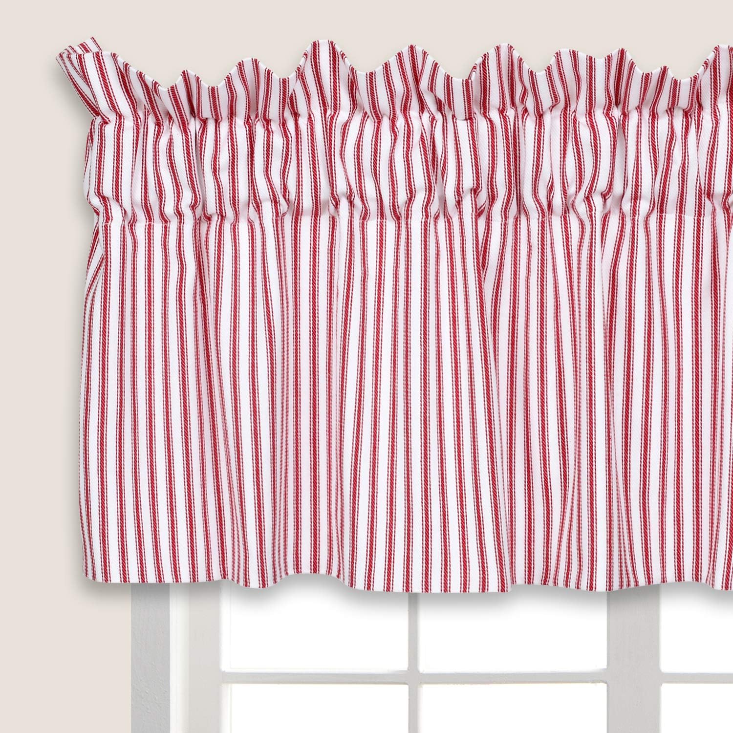 Classic woven red and white ticking stripe valance. Measures 72 inches wide by 17 inches long. 3 inch rod pocket. Fully lined with light color neutral fabric. 100% cotton. Machine wash cold, line dry. Made in India. Matching cafe curtains and kitchen textiles available separately. This beautiful valance complements both traditional and contemporary home decor.