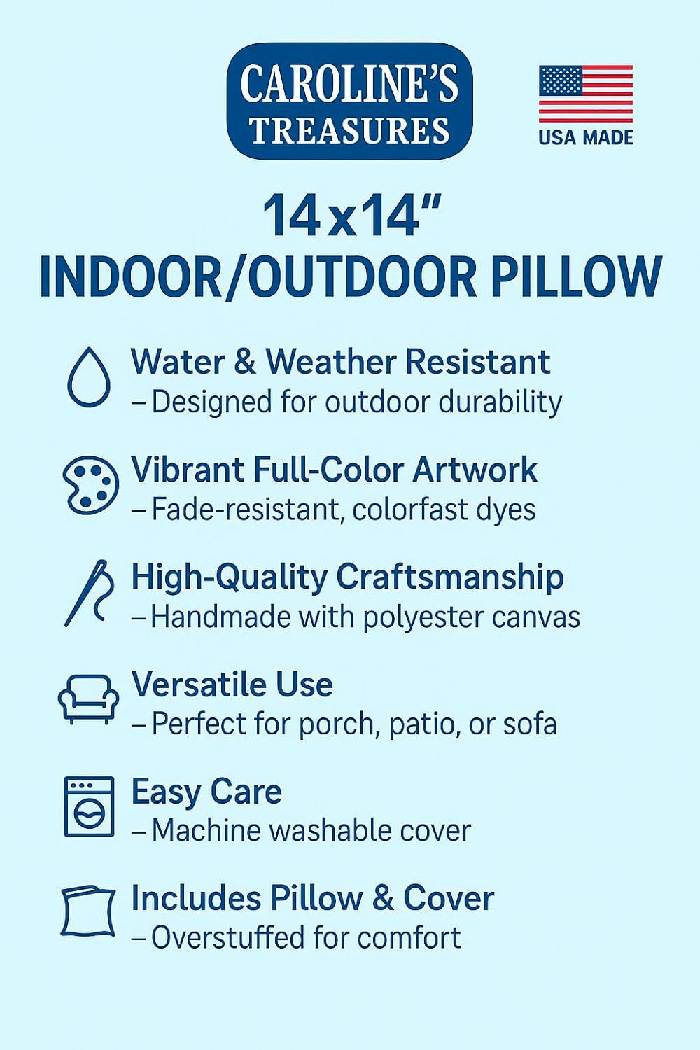 Features. Indoor or Outdoor Pillow from heavyweight canvas material. 100 Polyester Fabric pillow Sham with pillow form. Fade Resistant. Machine washable. Dimension - 14 L x 3 W x 14 H in. Item Weight - .65 lbs.