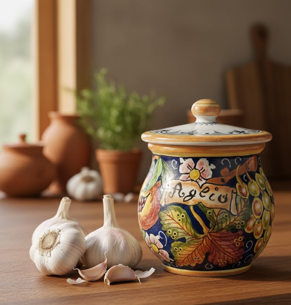 THE TOTAL PRICE INCLUDES CUSTOMS DUTY TAX PRODUCT INFORMATIONCeramic Brings Garlic jar .Decoration: Collection Grape ; bunch of white grapes, pomegranate, shaded leaves, small flower, all drawn on a completely blue background, orange / yellow borderDimensions: 5,51 inch maximum height at the lid x 4,33 inch x 4,33 inchPRODUCT INSTRUCTIONSAll our products are lead-free and can be used for foods and can wash in the dishwasher
