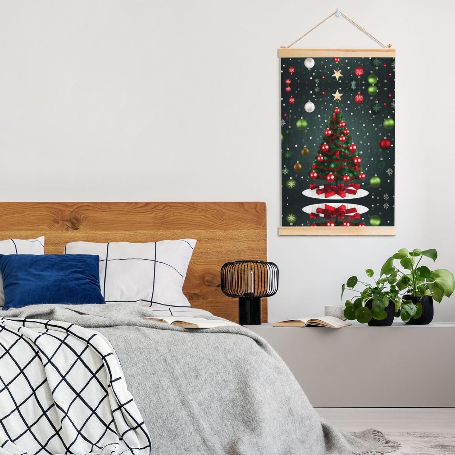 Our Christmas Tree And Ball Print Wooden Poster Hanger Is An Excellent Addition To Your Home Decor Or A Perfect Gift For Friends And Family. Made Of Selected Quality Canvas With Brilliant And Enduring Colors, This Wall Art Is Designed To Resist Water, Dust, And Fading, Ensuring The Bright And Vibrant Art Lasts. The Polyester Is Enclosed Between Two Teak Wood Hanger Scrolls With An Attached 35cm Rope For Easy Hanging. Installation Is Made Simple With The Included Two Nails In A Plastic Box. The Modern Minimalist Style Of Our Wall Hanging Complements Any Home Decor, Elevating The Artistic Ambiance And Brightening Up The Room. Experience The Elegant Transformation This Wall Hanging Scroll Painting Brings To Your Spaces Today.