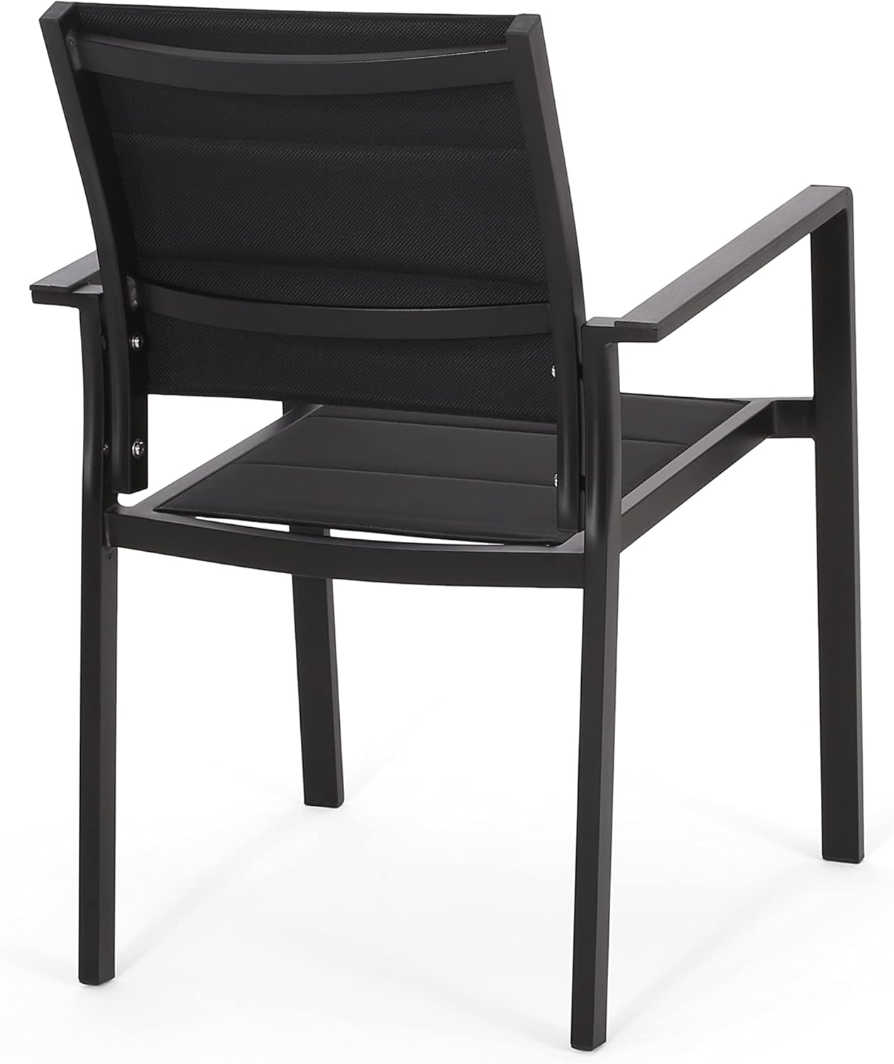 Escape the monotony of the indoors and enjoy a hearty outdoor meal in excellent seating. Made with aluminum frames that are accented with faux wood armrests, our durable and stylish dining chairs bring modern luxury and convenience to your backyard or patio space. This set of chairs is finished with breezy mesh seating that provides both incredible stability and unparalleled aesthetics for your space. From dinner parties to casual lounging, our dining chairs are the perfect finishing touch to any outdoor get-together.Frame Material: IronSeat Material: Outdoor MeshArmrest Material: Faux WoodFinish: BlackAssembly RequiredDimensions: 23.00 inches deep x 22.00 inches wide x 33.25 inches highSeat Dimensions: 17.25 inches deep x 16.00 inches wide x 17.00 inches highArm Height: 24.50 inchesWeight Capacity: 400 lbs