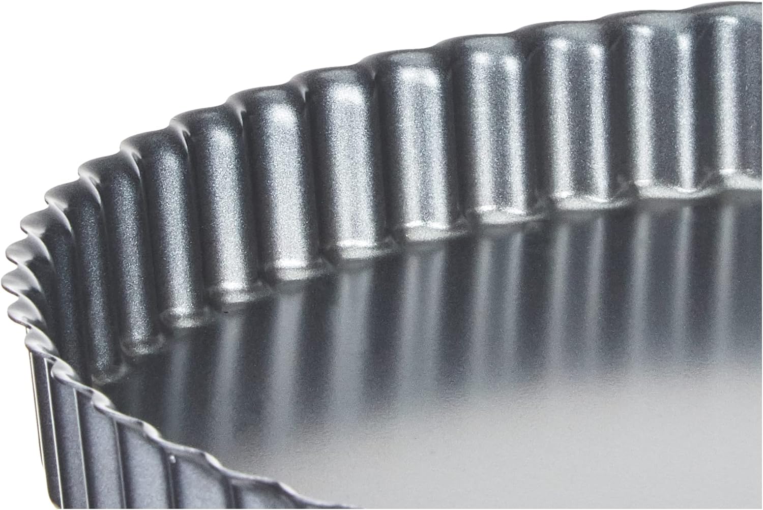 Product Description Thick-steel fluted pie mould, straight edge and fixed bottom: an authentic design. Ideal for cooking traditional tarts, tart bases, pies or quiches. Good cooking results thanks to iron: the moulds reach high temperatures, enabling the juices to caramelise. Even diffusion of heat and uniform cooking. Functional and practical non-stick mould: PFOA-free PTFE guaranteed coating for easier mould release, steel protection against oxidation and easy cleaning. Grease the mould before use. Traditional oven cooking (max. 220 degrees C). Not suitable for the microwave oven. Do not use metal objects in the mould. Care: wash by hand (non-abrasive sponge). Not dishwasher-safe. It measures 28 cm diameter by 3 cm height. It has 0.6 mm thickness. Set Contains: 1 x Round Fluted Tart Mould with Straight Edge, 32 cm