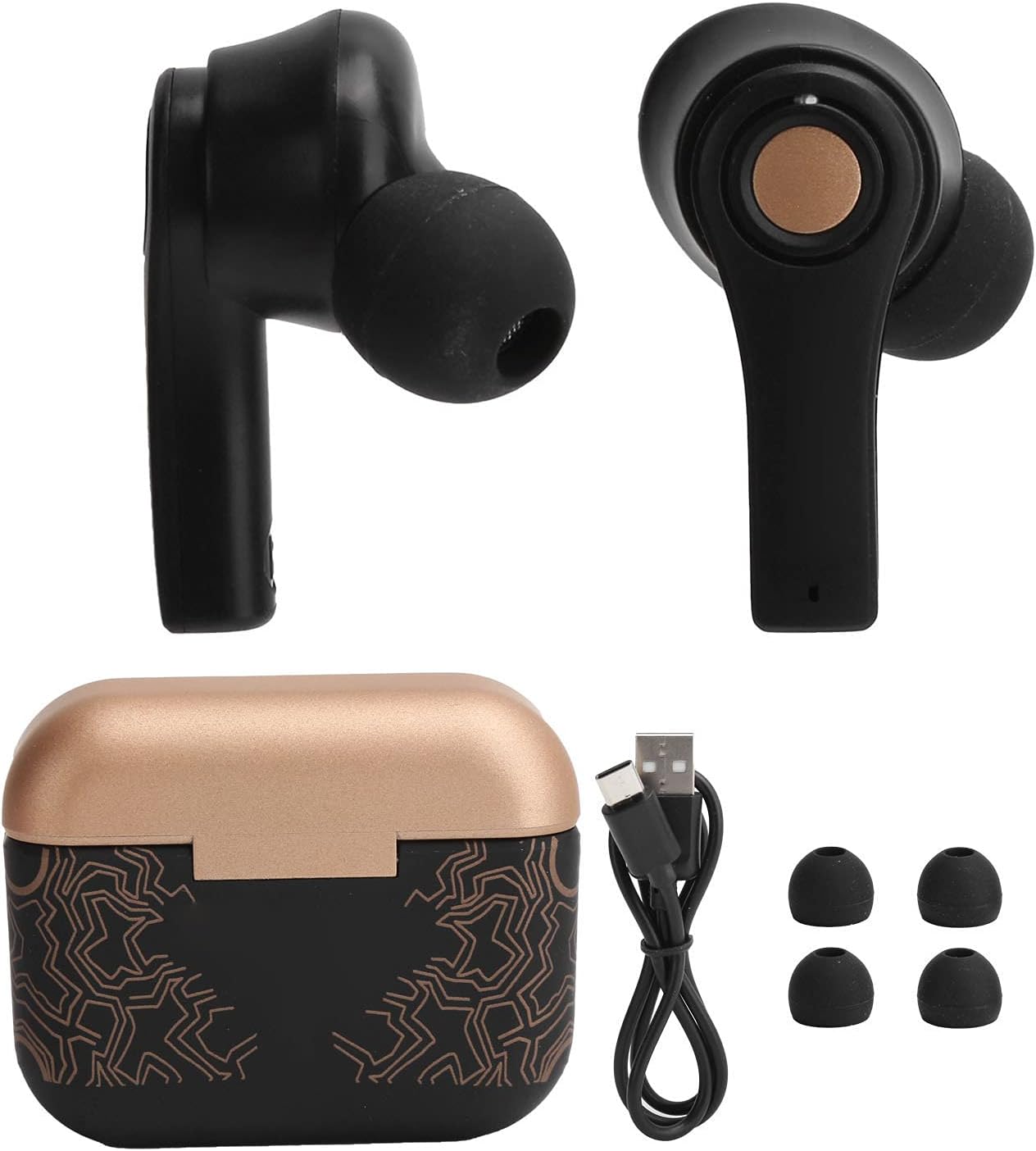 Specification: Item Type: Bluetooth Earbuds Marerial: ABS Weight: Approx. 120g/ 4.2oz Chip Version: V5.0 Horn Diameter: 13mm Distance: 18-20m Battery Capacity: 50mAh polymer lithium battery (shipped with built-in battery) Charging Case Capacity: 400mAh polymer lithium battery (shipped with built-in battery) Standby Time: 1-2 months Talk/music Playing Time: 3-5 hours Interface: USB C Charging Time: 1-2 hours Frequency: 2400.0-2483.5MHz Operating Instructions: 1. Switch on: Switch on the headset when out of the case, and display function on the mobile phone to be connected 2. Shutdown: Put the earphone in the charging case. The earphone shuts down and charges automatically 3. Matching: Automatic pairing 4. Answer the phone: click the multi-function key 5. Rejected calls: Long press the multifunction 6. Hang up: Click the multifunction 7. Play/Pause: Click the multifunction 8. Volume increase: Double click the multi-function on the main ear Volume reduction: double click the secondary ear multifunction Next song: click the main ear multi-function key for three times Last song: click the secondary ear multi-function key for three times Package List: 2 x Earbuds 1 x Charging Case 4 x Ear 1 x USB C Cable 1 x Instruction