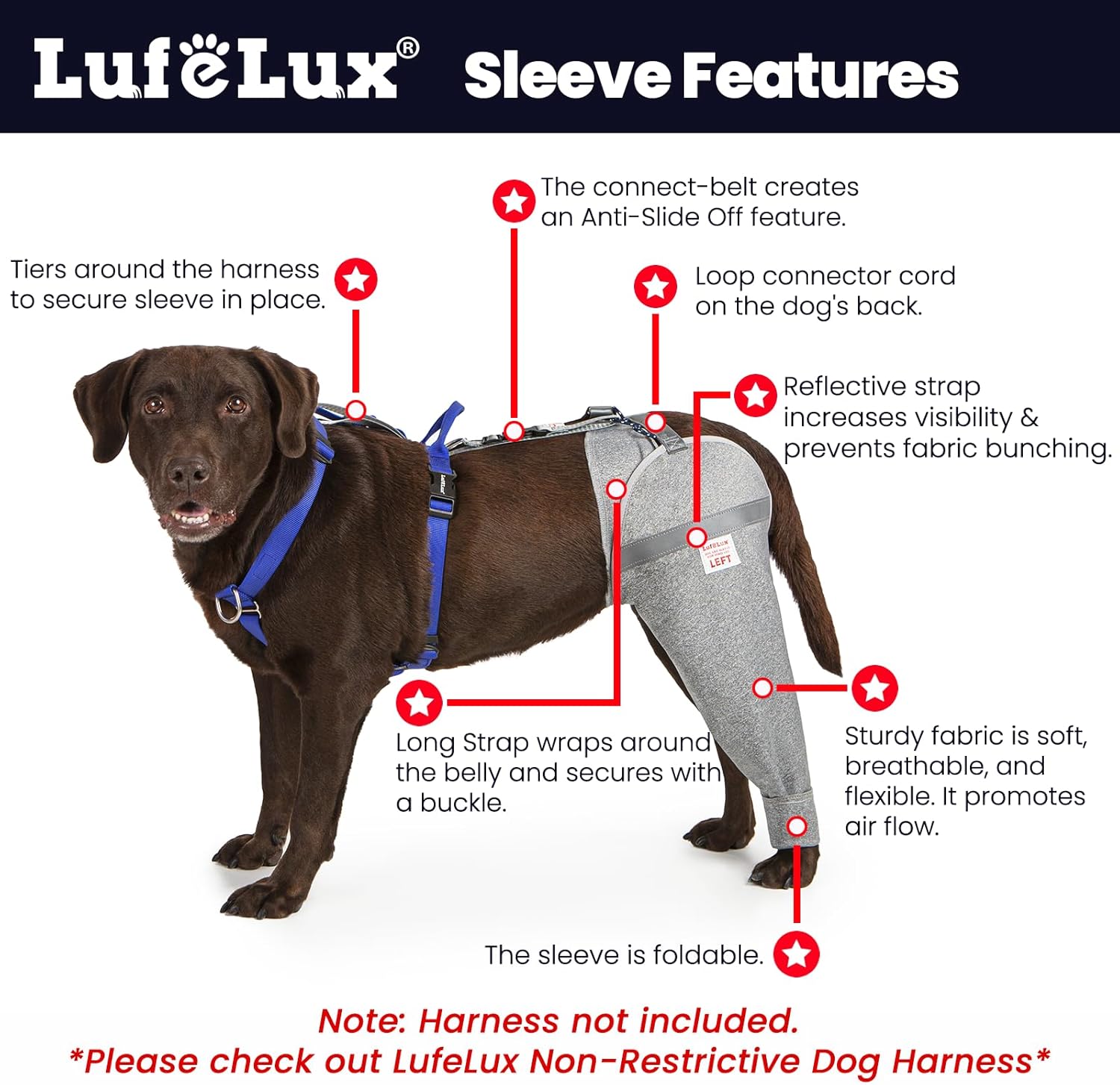 • 【Creative Anti-Slide Off Design】The dog sleeve is designed with a loop connector cord on the dog's back, allowing the connect-belt to thread through the loop and securely fasten to the dog's harness. By integrating the sleeve with the harness, this dual-point fixation mechanism effectively prevents the sleeve from sliding off, even during active movement.