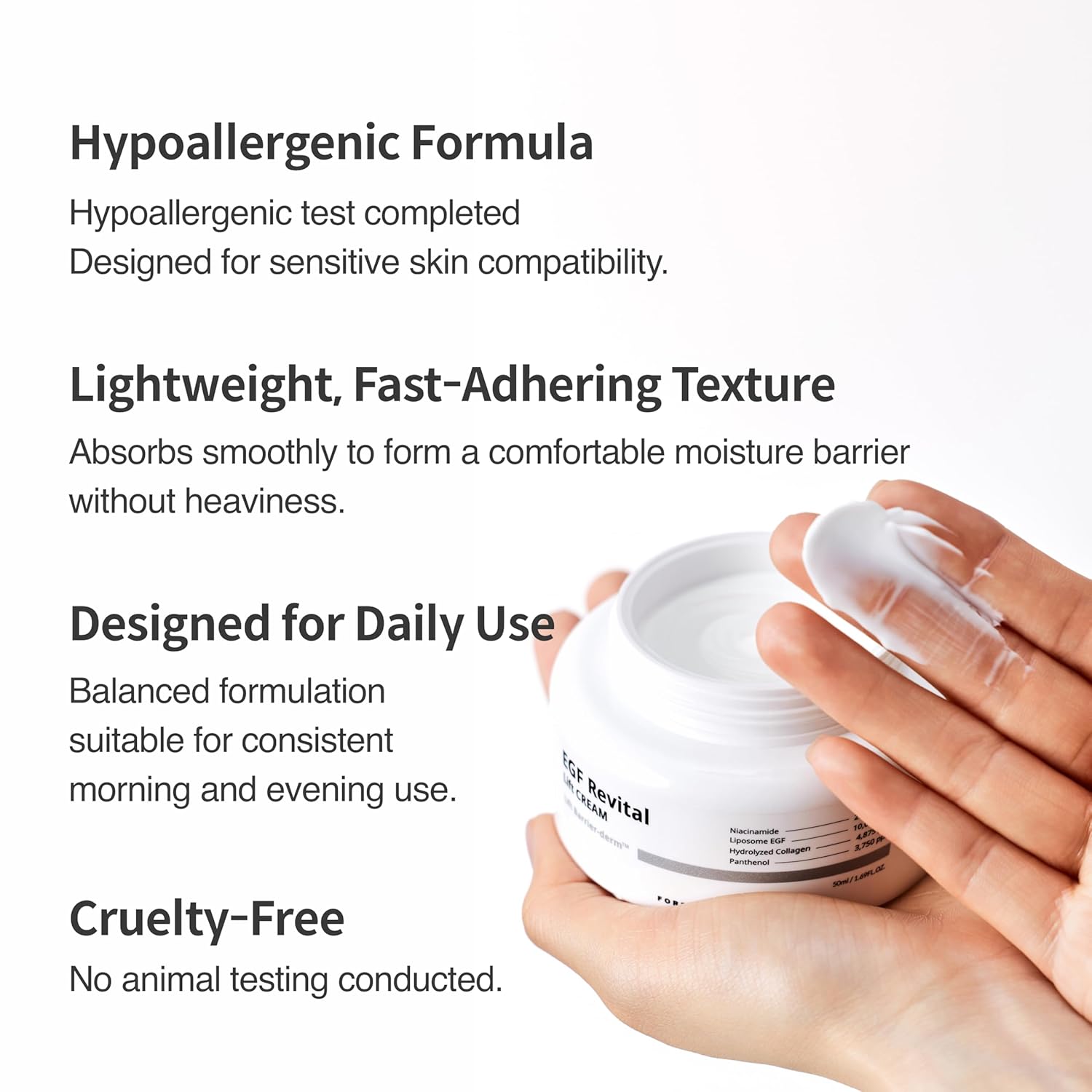 | Special Ingredients | Liposome EGF, Triple Hyaluronic Acid, Ceramide NP, Niacinamide, Panthenol, Shea Butter, Jojoba Seed Oil |
