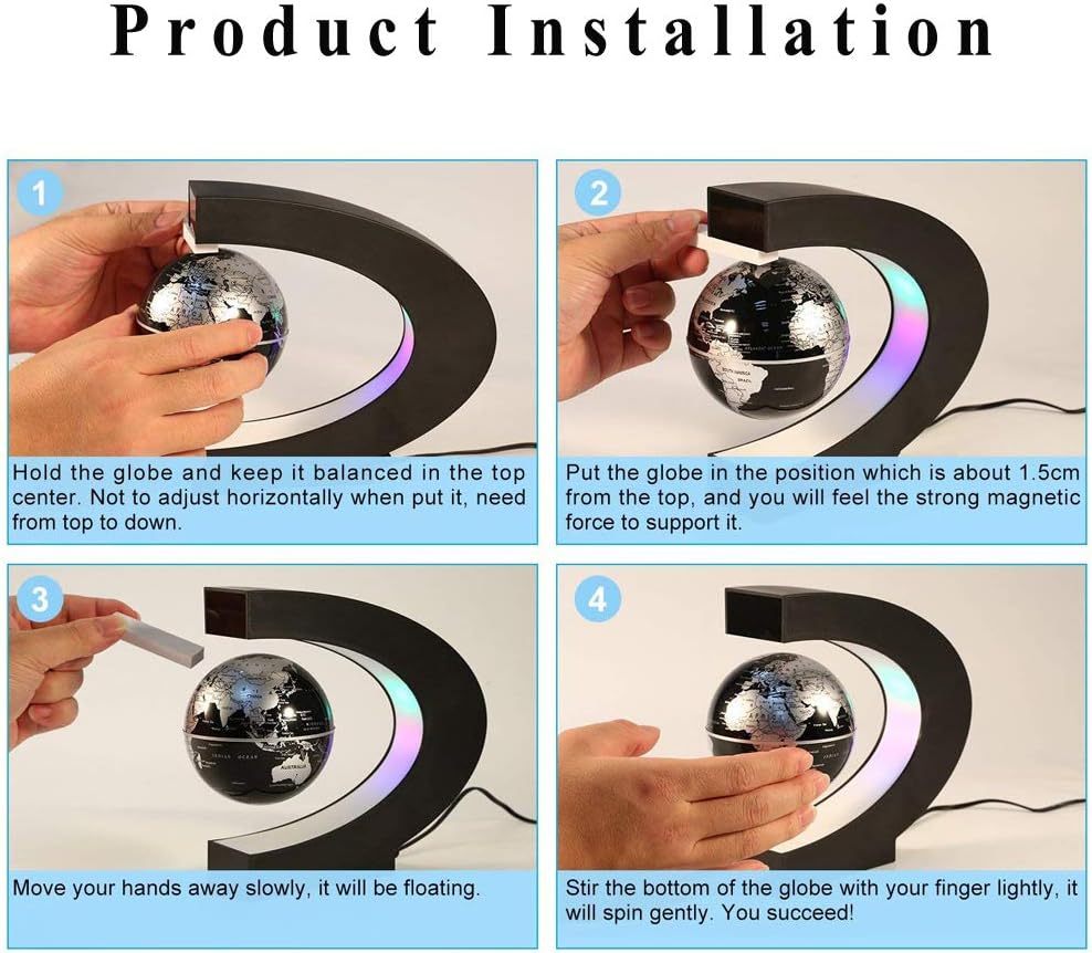 Description:Comes with a LED light that makes it look very cool when turned on in the dark.Operated by an electronically controlled magnetic system.The magnetic above the gadget contains an electro magnet and a magnetic field sensor.Once you get the gadget levitating, just give it a little spin with yourand watch it rotate for an extended period of time.This cool gadget makes a great display unit for your retail shop, business and home.Specifications:Input Voltage: 110 to 240V ACOutput voltage: 12V 250mASize: 21.5 x 20 x 10cmMaterial: ABS plastic, rubber oil coated and metalColor: Gold, BluePlug type: US plug, EU plug, UK plug, AU plugPackage includes:1 x Globe1 x C Shape Base1 x Wall Adapter