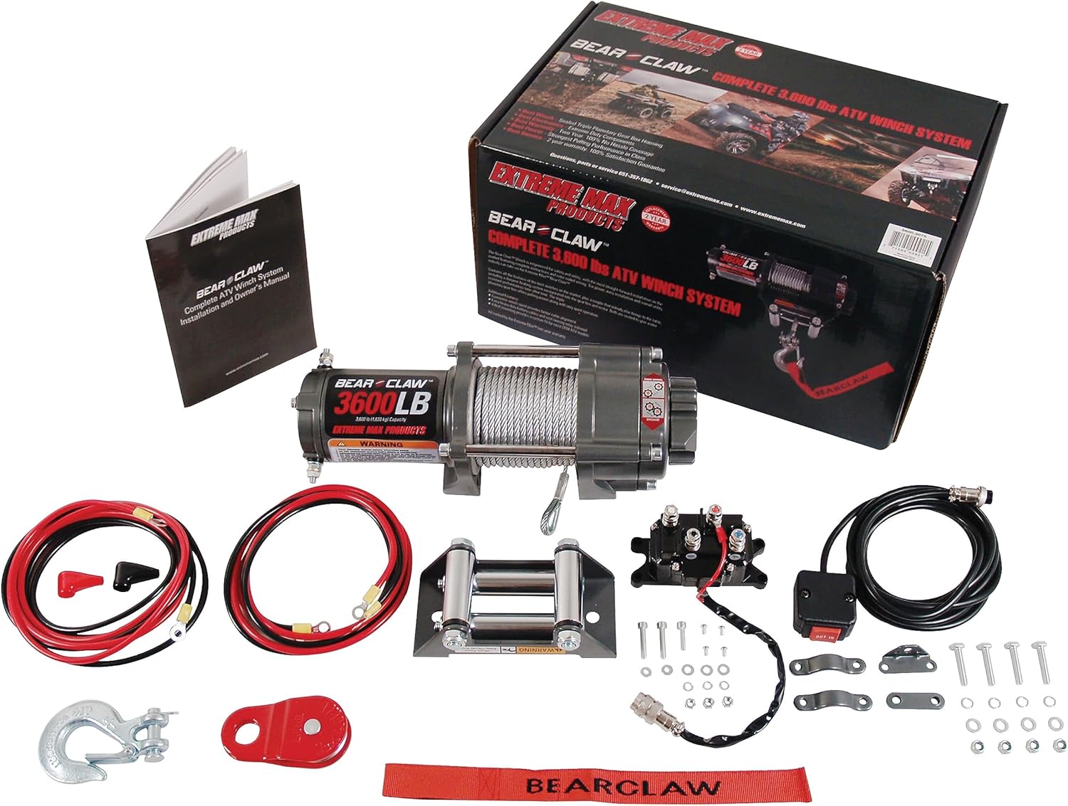 Extreme Max Bear Claw Winches bring the kind of power that can't be ignored, packing more pull into a compact, rugged package that's ready to take on tough situations. This 3100 lb. winch has the same footprint as a 3000 lb. model, with the extra strength and features you demand. We've got all the features of the best winches on the market, plus a couple that nobody else brings to the table, including a dynamic braking system incorporated into the gear box and motor. Both are sealed to protect against water time after time. The triple planetary gear box offers extra pull along with quiet operation. Extreme Max Bear Claw has been engineered for the easiest installation on the market, with color-coded wiring and complete installation instructions. You Get: Everything you need to get you out of the worst environments imaginable. (1) Bear Claw 3100 lb. High Output Power ATV Winch (1) 45' cable with zinc-plated 1/4' hook kit (1) 4-way roller fairlead (1) powder coated steel snatch block (1) handlebar rocker switch (1) solenoid (1) nylon safety pull strap (1) heavy-gauge battery cable with connectors (1) heavy-gauge motor cable with connectors (1) complete hardware mounting kit (1) user's manual with easy-to-follow, detailed installation instructions. All backed by a 2-year warranty.