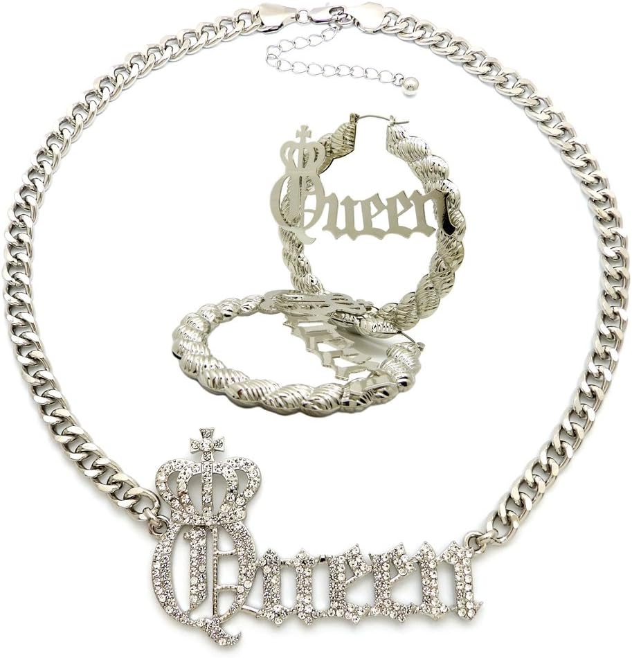 Women's Statement Queen Necklace ,Bamboo Hoop Pierced Earring Set in Gold, Silver Tone Please do not shower, sweat excessively, wear in pool/ocean or expose our jewelry to harsh chemicals. Our jewelry does not rub off at all or fade/chip/tarnish easily. Please store in proper jewelry pouch and jewelry box.
