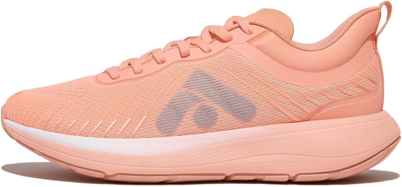 It's free, feels great, and facilitates your physical and mental wellbeing – running is a life enhancer. So FitFlop set out to create the world's most comfortable running and exercise shoe. Biomechanically optimized for endurance running, eg suitable for 10K (but also for sports/gym or just upping everyday activity). Ultra light. High performance. Crafted in a soft stretchy mesh, engineered for high breathability at the vamp/toe and extra support at the sides/arch. 3D-printed detail and sole ombré effects/texture elevate the aesthetics. Padded on the collar/tongue. With easy foot entry thanks to a separate tongue/classic lacing, which also ensure the customized fit and security needed for running. All on a new 'performance' version of FitFlop's Neodynamic propulsion-plate midsole. Lighter. Even springier – its innovative wishbone-shaped inner plate gives multi-directional propulsion, working with how the foot naturally moves (side to side as well as forward/back). More cushioned, in the highest-rebound impact-reducing EVA FitFlop has ever used. With an enhanced toe spring/heel kick for a smoother 'ride'. In a flexible yet stable women's-specific design, maximizing comfort and running efficiency (so you use less energy and can keep going longer). If the FFRunner doesn't get you running, nothing will. Note: These are engineered for a woman's anatomy/gait, not just a sized-down men's running shoe. Other features: • Superlight flexible knitted tongue • Anatomically contoured footbed for superb arch support & pressure diffusion • Sole flares out at forefoot & heel to increase stability • Light rubber outsole pods with extra grip & wear resistance for endurance running (grip suited to country paths/light trails) • Outsole also has flex grooves to help feet move naturally & channels to reduce aquaplaning • Contrast-color 'wishbone' propulsion plate visible on bottom of sneaker