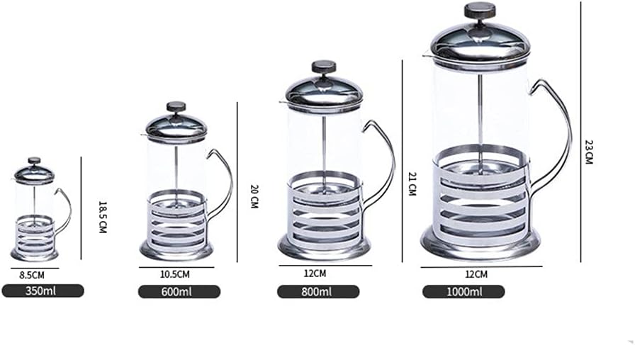 Maximum flavor: Extract all essential oils from your coffee grounds, and capture the pure flavor with this classic brewing method. Package Included: 1 x French Press Coffee Maker Specification: Size: 23x12cm,21x12cm,20x10.5cm,18.5x8.5cm Color:Silver Material: Stainless steel+ Glass Capacity: 350ml , 600ml , 800ml , 1000mll Features: stainless steel giving the french press a resilient shine and protecting it from rust. The French press filters are polished ,so you don't have to worry about being hurt. Note: Since the manual measurement, 1-3cm around a normal error. Due to different monitors will have differences of colors, the picture for reference only, please refer to the object as a criterion. Fashionable and design: Shatterproof glass bottle, fine stainless steel mesh screen and comfortable handle design are adopted.
