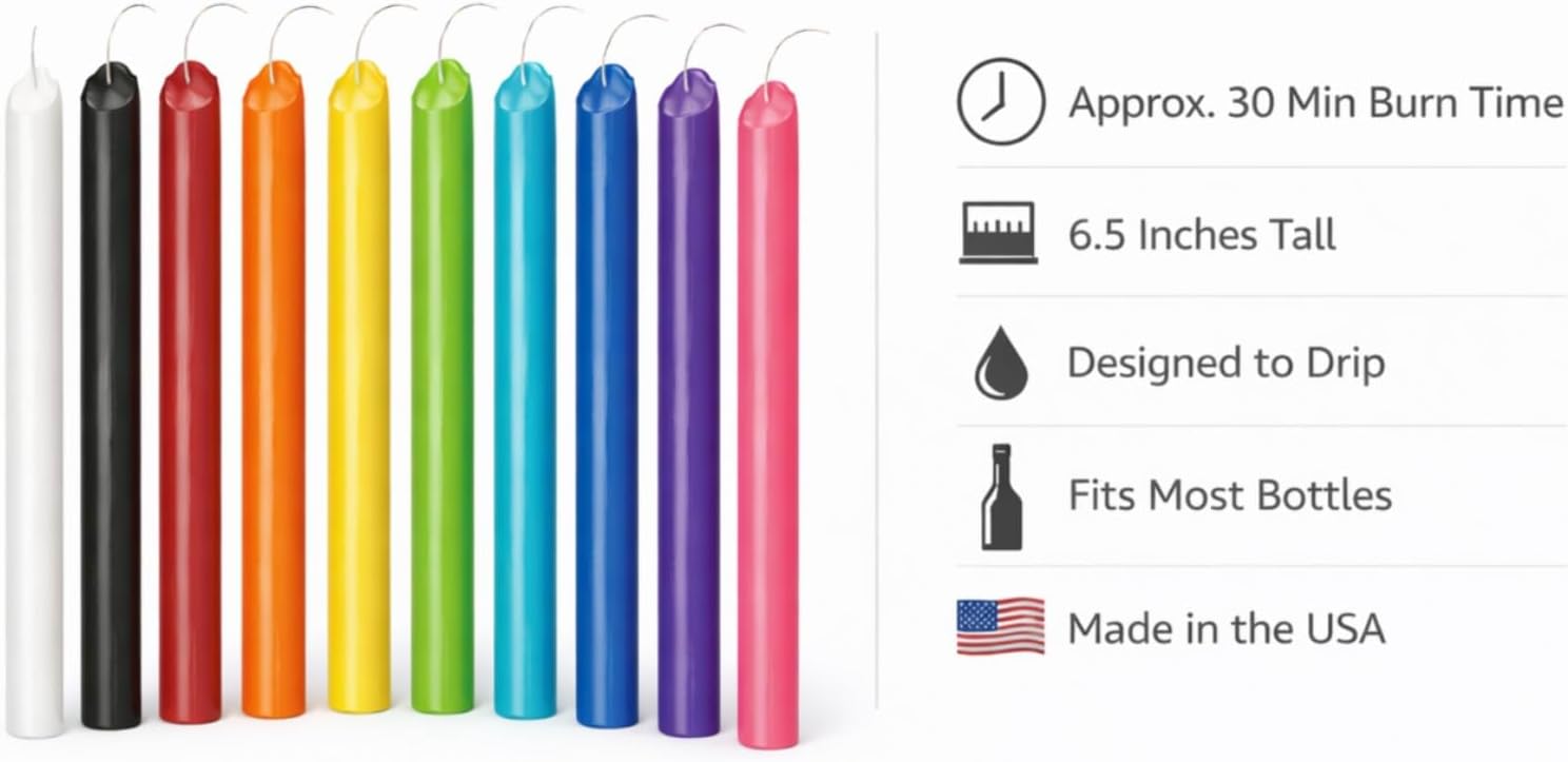 Bring your décor to life with Funny Guy Mugs Drip Candles — the original drip-style melt candles designed to transform ordinary bottles into unforgettable art pieces. Each 12-count pack features a carefully curated blend of colors that melt beautifully down glass bottles, creating bold, layered drip effects perfect for parties, bars, weddings, holidays, and creative home décor. Our smokeless, unscented formula provides a clean, even burn without overpowering fragrance, making them safe for indoor entertaining. At approximately 6.5 inches tall, these slim candles fit most wine, liquor, and decorative bottles for effortless setup. Whether you’re hosting game-day gatherings, decorating for the holidays, or creating eye-catching centerpieces, Funny Guy Mugs Drip Candles make every bottle a conversation piece.