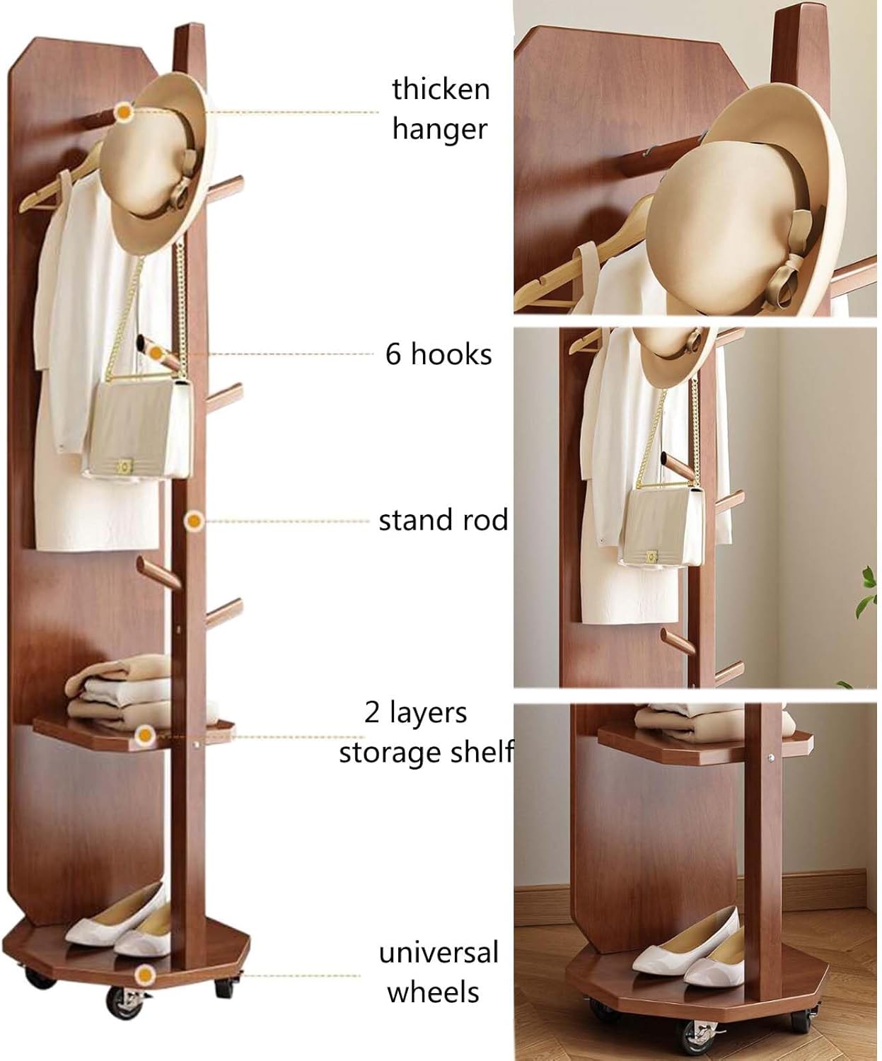 Features: 1. 360° rotating full length mirror, beautiful and practical. 2. HD mirror has high clarity and is not easy to deform. Large size mirror allows you to check your attire. 3. Coat rack come with hooks and storage dividers, save space. Product Parameters: Color: Brown, Log Color, White, Black Material: wood + explosion-proof mirror Style: modern simple Size: 45* 45* 166cm/17.7* 17.7* 65.3in Package: 1 * Full Length Mirror 1 * Instruction