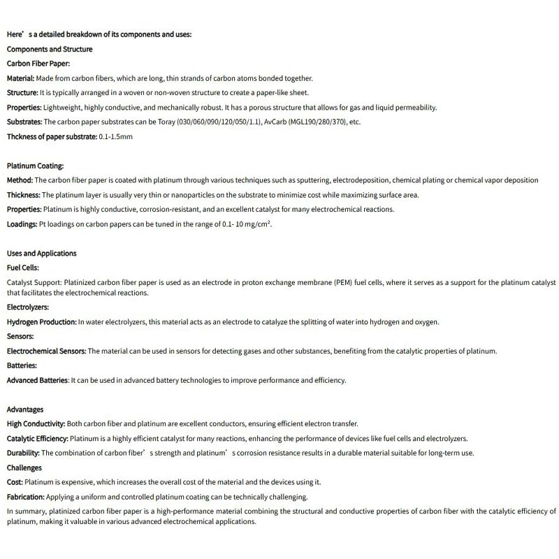 In summary, platinized carbon fiber paper is a high-performance material combining the structural and conductive properties of carbon fiber with the catalytic efficiency of platinum, making it valuable in various advanced electrochemical applications.