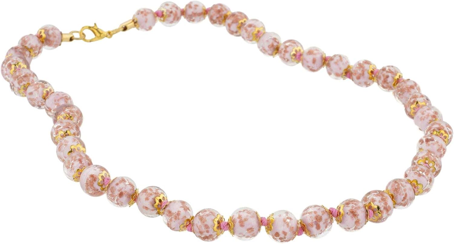 The trendy sparkly Murano Glass Necklace can be easily identified as the magical work of Murano masters by its gorgeous colors, swirling patterns within each bead, and signature aventurine gold sparkles. To achieve such effects, the glass-makers employed Sommerso technique, where colored threads of glass are then submerged in a layer of transparent glass to create a layered effect. The copper particles infused into glass create subtle golden glitter and shine through under all lighting conditions. Each bead is hand-blown and consequently has a unique slightly uneven shape. Stylish, artistic, and one-of-a-kind, this Venetian necklace will attract attention in any setting. Give this beautiful Murano Glass jewelry gift to yourself or someone you love.