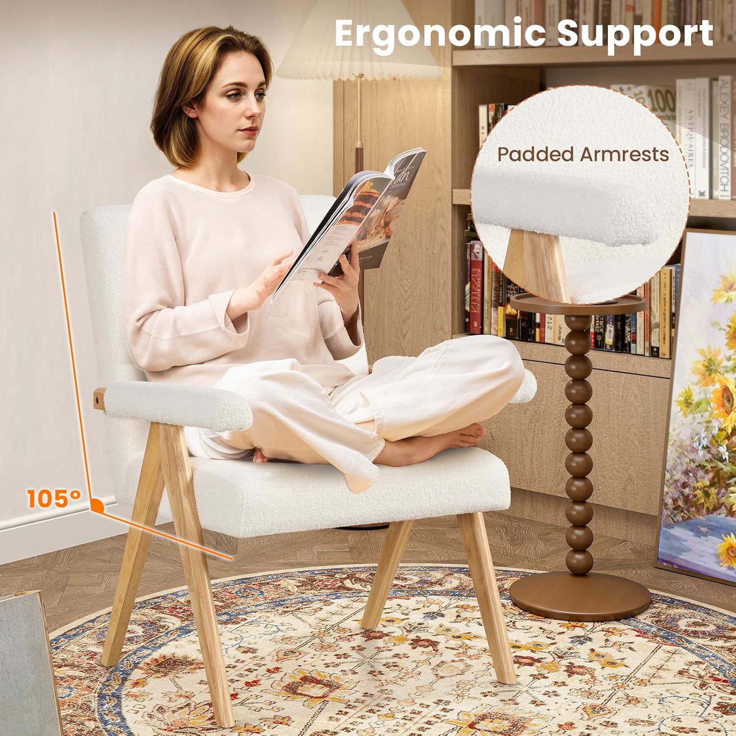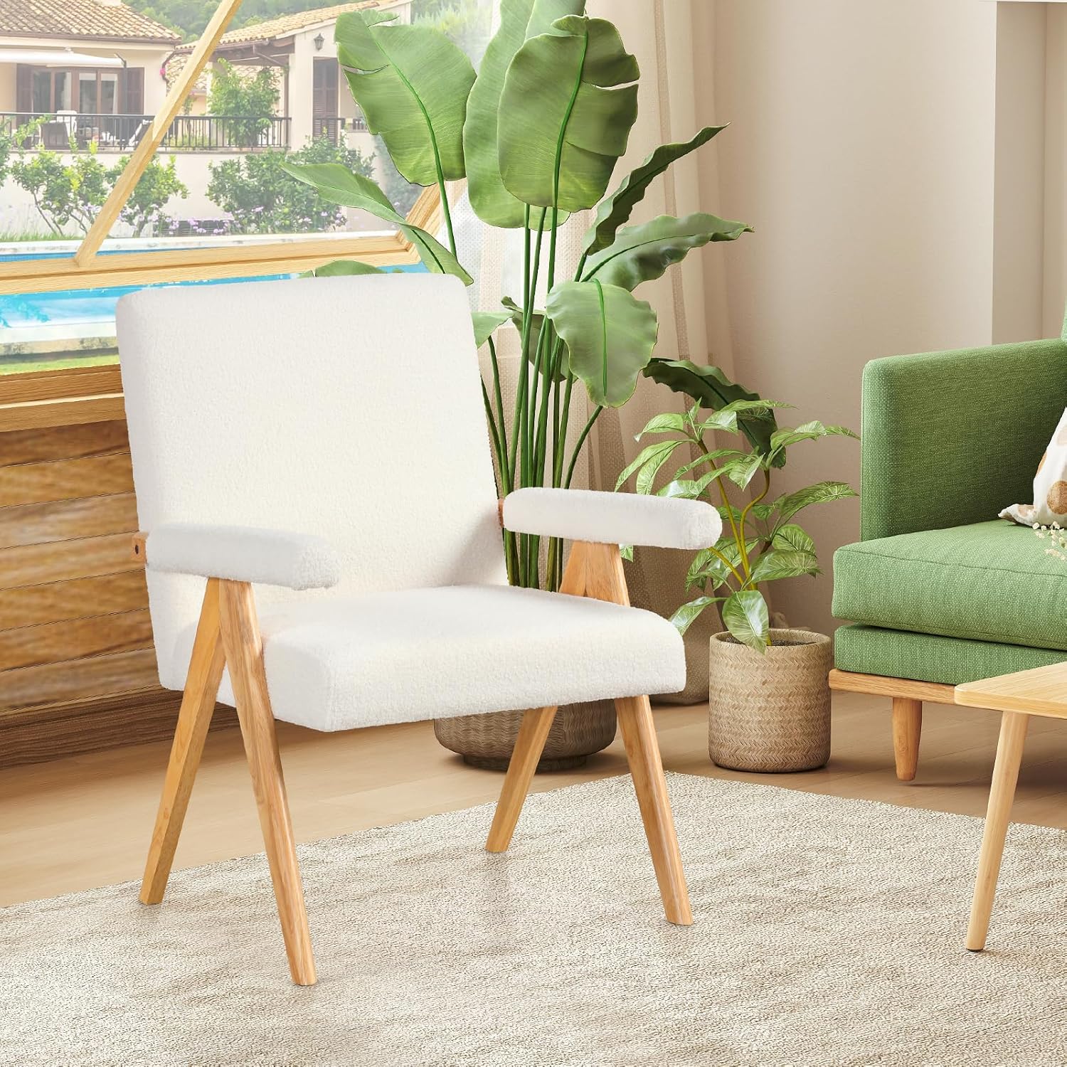 Enhance your home decor with this fabric accent chair. It is crafted from solid rubber wood for a sturdy build that easily supports up to 350 lbs. Plus, the addition of non-slip foot pads enhances stability, providing peace of mind during use. A generous cushion offers soft and supportive seating, while the luxurious sherpa fabric ensures a comfortable sit every time. Designed with well-being in mind, this lounge armchair features 105° ergonomic backrest and padded armrests that support your body. Moreover, the mid-century modern aesthetic seamlessly integrates into various rooms, enhancing the overall ambiance of your space.