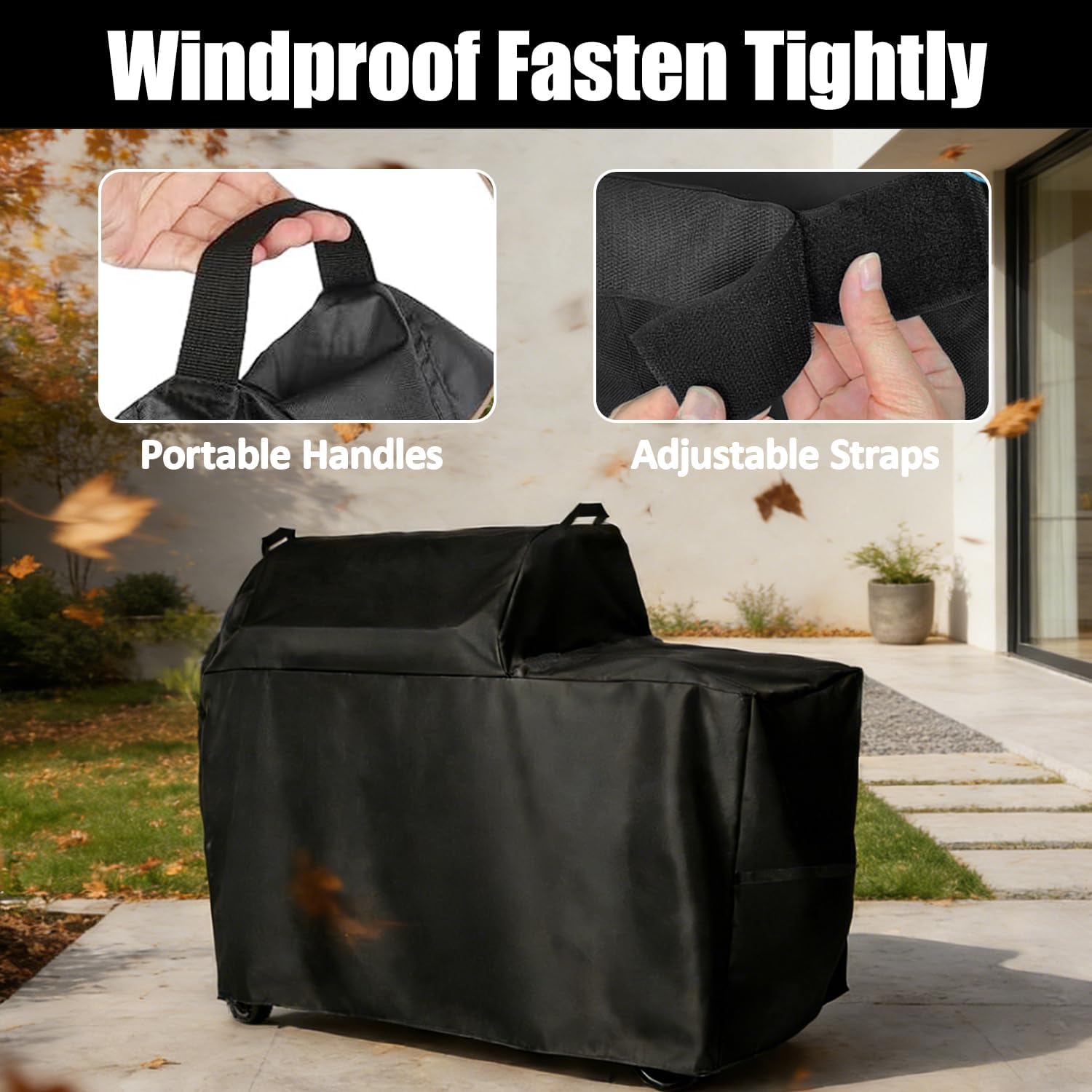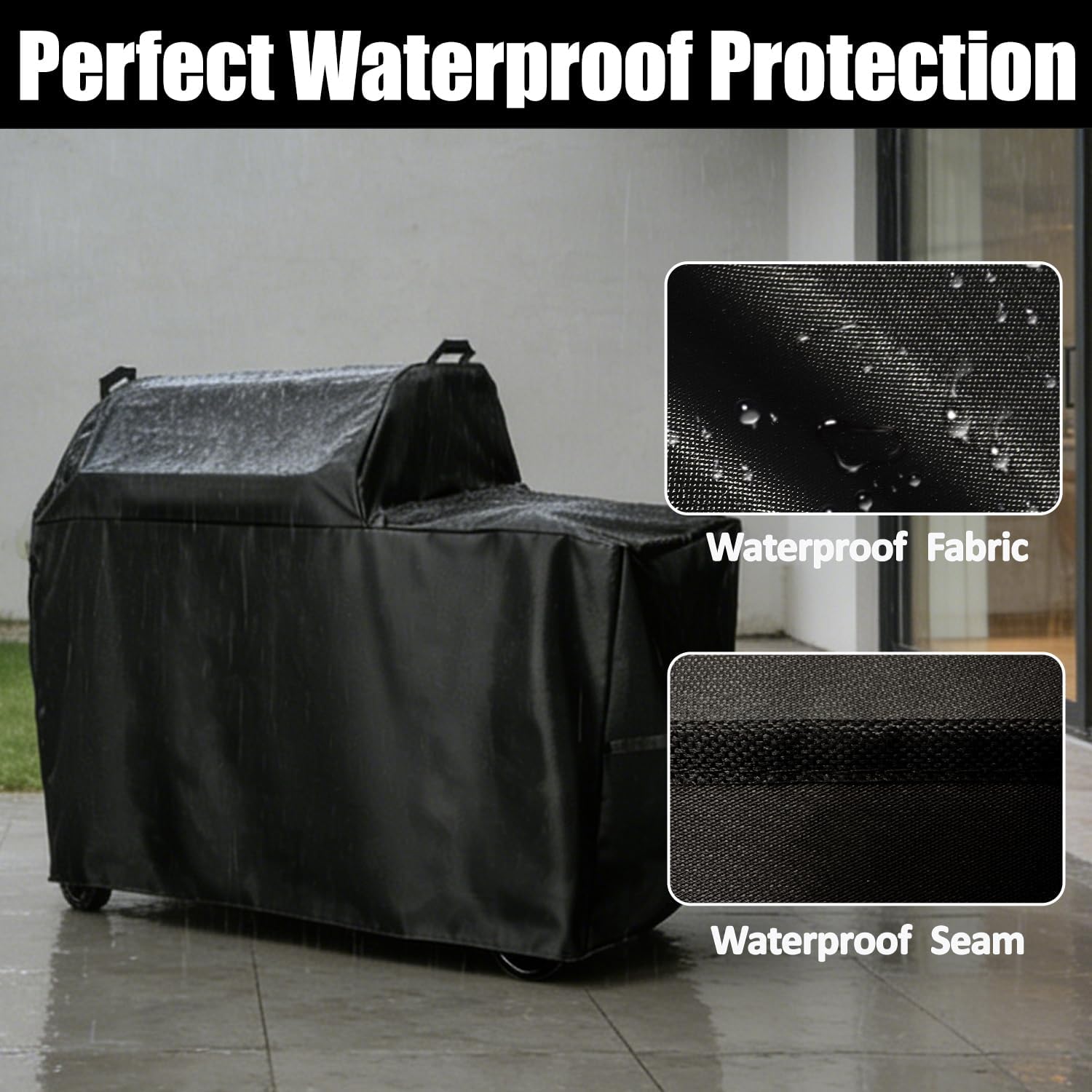 Perfectly Compatible with Traeger Grill Compatible with Traeger Woodridge Wood Pellet Grill TFB86MLHSuperior ProtectionMaterial: 600D heavy-duty Oxford fabric with a waterproof PVC coatingFeatures: Waterproof, Dustproof, Windproof, Snowproof, Rip-resistant, Fade-resistantAir Vent: Built-in ventilation vents reduce condensation and prevent moisture buildup, keeping your grill dry and rust-free.Handles: Easy to put on and take off, allow for easy hanging, helping the cover dry quickly, also for minimal storage spaceStraps: Anchors the cover firmly in place, providing exceptional stability and wind resistance even during sudden gustsDimensions:52"W x 46"D x 28"H