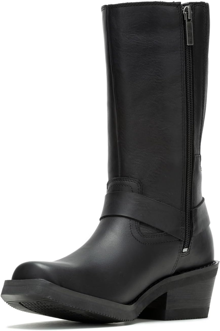 Harley-Davidson Women's Korsen 10-Inch Black Waterproof Fashion Harness Boots, D87296. The popular Korsen Harness has been given added height and styled with a checker board stripe and flower detail - a fun addition to your everyday wardrobe. Featuring heat deflecting full-grain leather, a waterproof Breathable Hydro-Guard waterproof membrane lining, a rubber outsole, and an inside gore for the optimal fit, this core style is versatile in both function and style. Made with a western flair, this full-grain leather boot with its Harness detail is ideal for everyday wear - at the office, for social functions, line dancing at the club, or for everyday wear. The YKK locking inside zipper offers the quick and secure fit that you crave. The toe is squared, invoking a little more western edge. The classic O-Ring harness style is both versatile and functional, supporting both the fore and after straps. A debossed silhouette Bar & Shield logo in on the heel’s counter. A feminine touch has been added at the top of the shaft, above the checker board stripe. The boot's sole, insole and upper are bound using cement construction processes, a time honored and durable method that allows for a flexible and easy stride. The western heel provides an ample 2.25-inch lift, and the rubber outsole means a soft landing with each step. A Bar & Shield logo is inserted into the street side instep. Pair with jeans, dresses or middies for a modern uptown look wherever you go. Total height: 12.25", Shaft height: 10", Heel height: 2.25". Sizes US: M 5-10, 11. Manufacturer Part Number, D87296. These boots are not recommended for wear while riding a motorcycle.