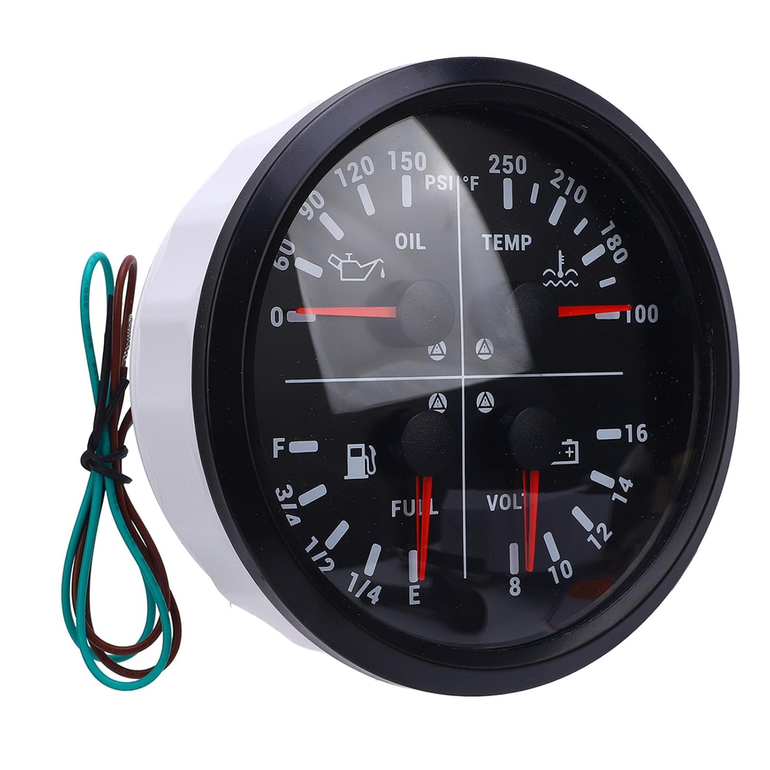 1. Multi Function Design: This 4 in 1 multifunction gauge combines oil pressure, oil level, water temperature, and voltage monitoring into one compact meter, saving valuable dashboard space while providing comprehensive data. 2. Wide Indicating Range: The gauge features a broad indicating range, oil pressure 0-150PSI, water temperature 100-250℉, fuel level E 1/4 1/2 3/4 F, and voltage 8-16V, ensuring accurate readings for various conditions. 3. Input Signal: This multifunction gauge supports 10-184ohm for oil pressure, 301-22ohm for water temperature, and 0-190ohm/240-33ohm for fuel level, making it adaptable to different systems. 4. Simple Installation: Cut a 110mm diameter hole in the dashboard mounting panel, and make sure there is at least 55mm of space behind the dashboard panel. 5. Universal Application: Ideal for motorhomes, yachts, and trucks, this 4 in 1 multifunction gauge is built to withstand diverse environments, providing long lasting performance for a wide range of vehicles. Spec: Item Type: 4 in 1 Multifunction Gauge Oil Level Gauge: E 1/4 1/2 3/4 F Oil Pressure Gauge: 0-150 PSI Water Temperature Gauge: 100-250℉ Voltmeter: 8-16V Oil Pressure Sensor: 10-184ohm Temperature Sensor: 301-22ohm Oil Level Sensor: 0-190ohm, 240-30ohm How to Use: Black=Negative Red=Positive Blue=Oil level signal Yellow=Backlight White=Water temperature signal Brown=Oil pressure signal Green=Signal output PackageList: 1 x Multifunction Gauge 1 x User Manual