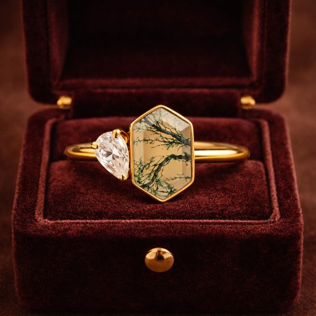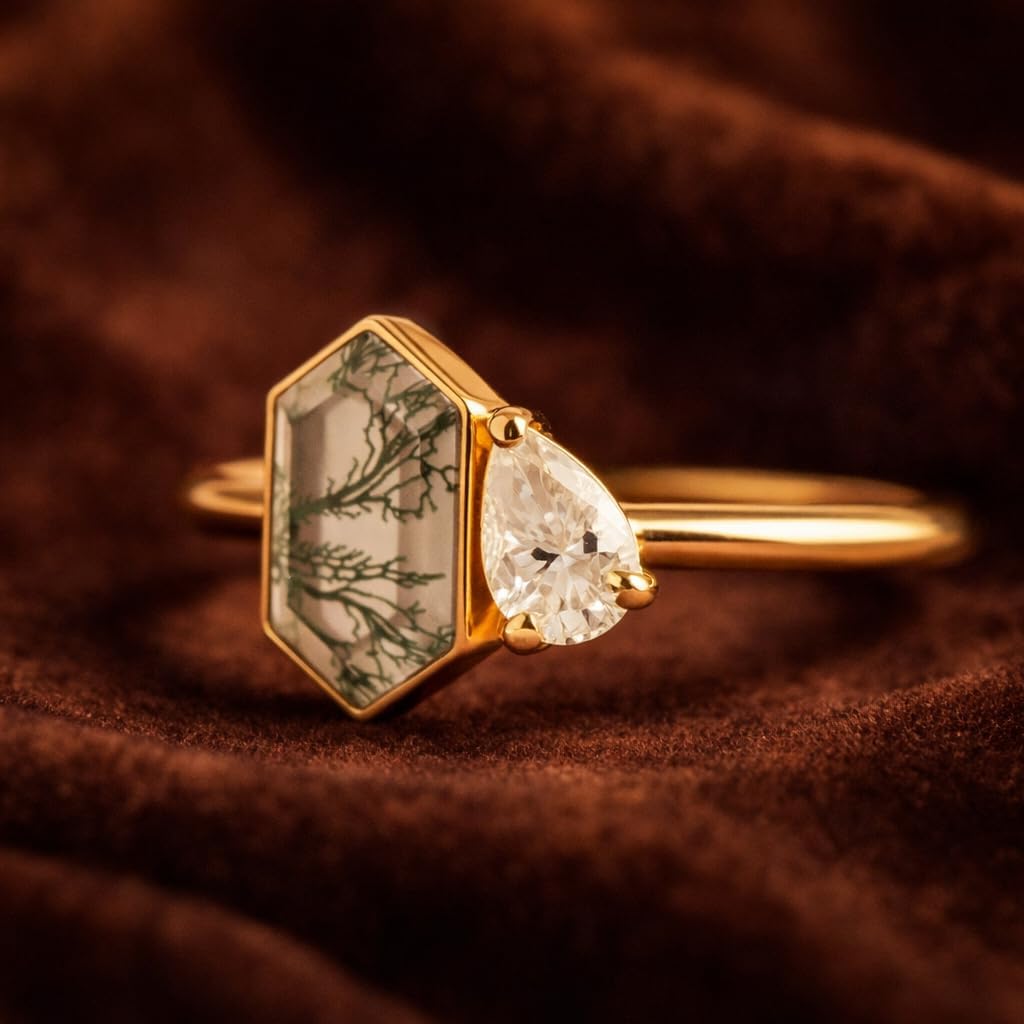 Celebrate your love story with this elegant Toi et Moi Moss Agate and Moissanite Engagement Ring, a romantic design inspired by nature and timeless beauty. The centerpiece features a mesmerizing hexagon cut moss agate, showcasing delicate green inclusions that resemble natural foliage — meaning growth, harmony, and new beginnings. Alongside it sits a brilliant pear cut moissanite, offering exceptional sparkle and fire like a diamond. Handcrafted in solid 14K yellow gold, this ring blends modern minimalism with bohemian charm. Each moss agate stone is naturally unique, so no two rings are ever identical — making your ring as special as your relationship. This ring is perfect as an engagement ring, promise ring, or anniversary gift and is loved by brides who want something unconventional yet elegant. A meaningful symbol of two lives joining together, this Toi et Moi ring represents connection, balance, and everlasting love.