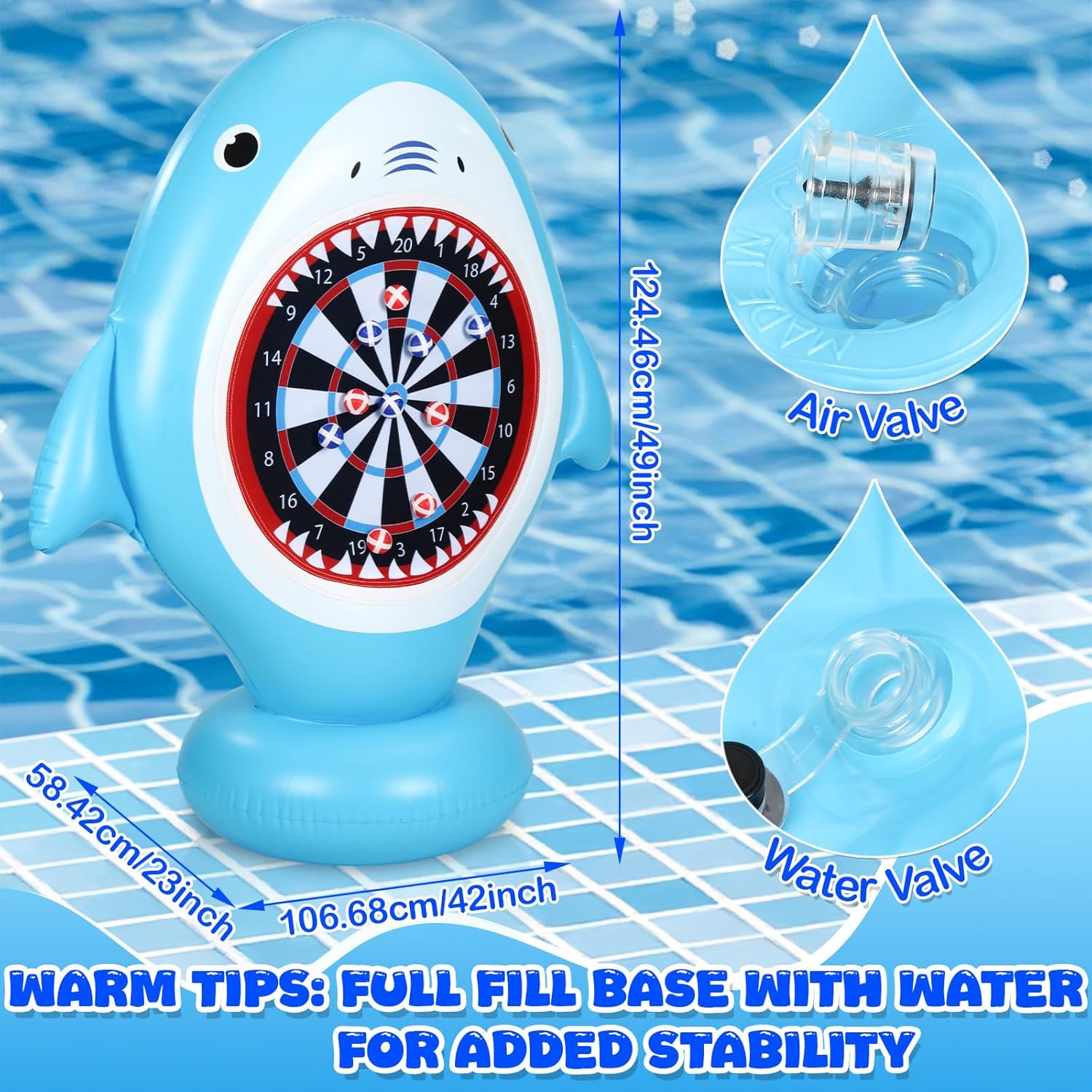 Features: VERSATILE PLAY: This inflatable toss ring game toy can play in water, lawn, outdoor and indoor. Suitable for family and friends games, swimming pool games, summer beach parties, swimming pool parties, swimming pool parties, outdoor indoor team activities, birthday, carnival parties, picnics or barbecue school activities supplies. Convenient & Simple: Just inflate and go. The lightweight, inflatable board deflates quickly and folds into the bag, making it ideal for camping trips, beach vacations, or backyard. It's easy to set up and provides hours of fun for adults Specifications: Material: PVC Color: blue Package includes: 1 X Shark-shaped Dart Pool toy 10 X Balls Notes: Manual measurement, please allow slight errors on size. The color may exist a slight difference due to different screen displays.