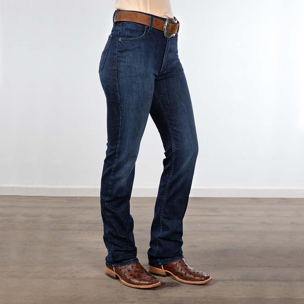 Meet the Show Stopping Sarah, a performance-driven, high-rise jean designed to flatter, flex, and keep up with your Western lifestyle. Built with a slim fit, fitted thigh, and sleek bootcut leg, Sarah blends function with feminine style. Crafted from our tri-blend stretch denim, she delivers comfort, rebound, and durability in the saddle or on the move. Finished with a medium wash and signature horn embroidery on the back pockets, this versatile jean brings classic Western confidence to every ride, arena run, and everyday moment.