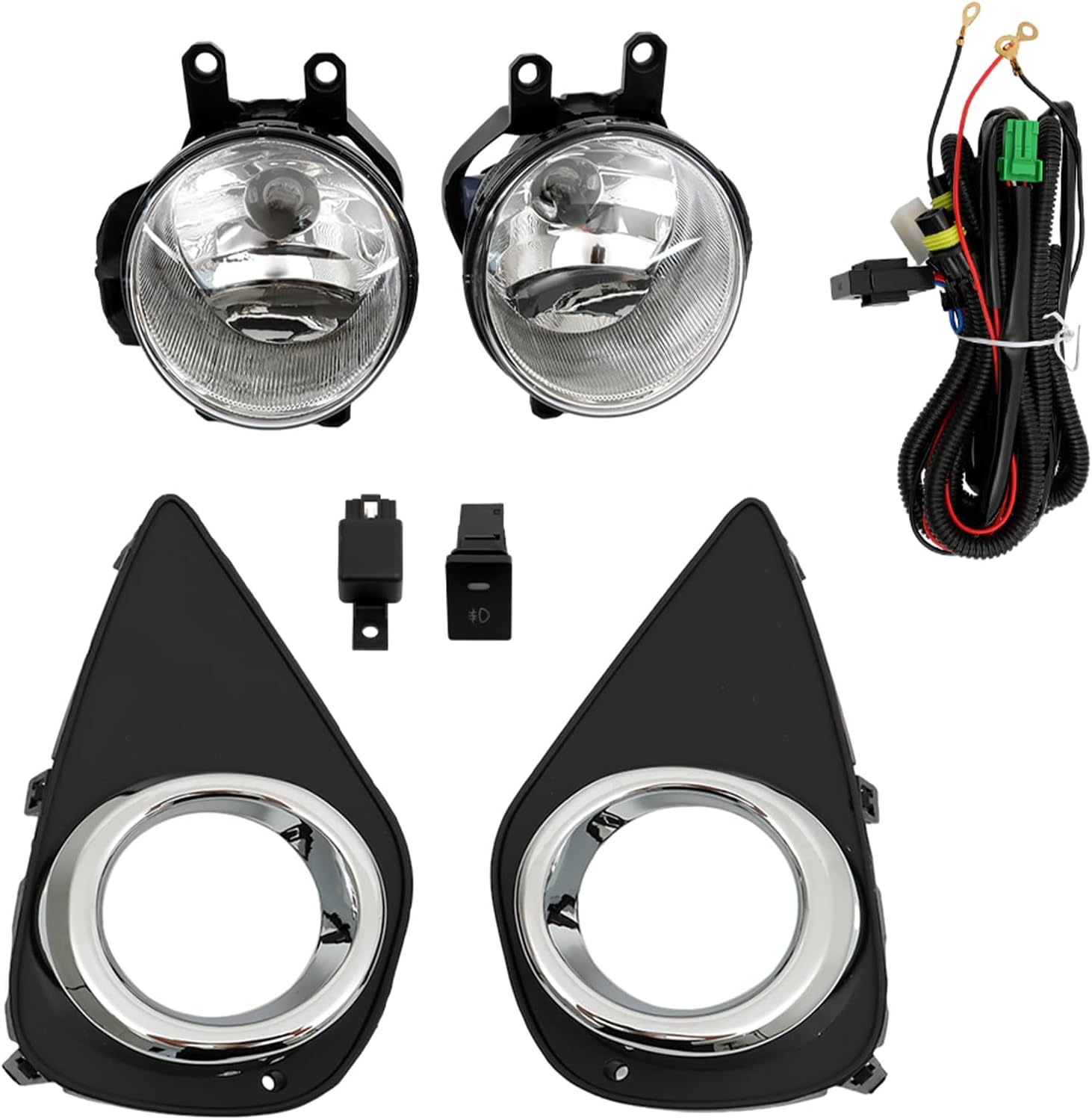 Detail: Color: Clear LensBulb Type: H11 Halogen BulbBeam Type: Halogen ReflectorVoltage: 12VWattage: 55WPlacement on Vehicle: Front, Left, RightPart Number: TO2592131, TO2593131, 8122002110Fitment:Replacement for 2015 Yaris HatchbackReplacement for 2016 Yaris HatchbackReplacement for 2017 Yaris HatchbackPackage Includes:1 Pair Fog Lights (Left & Right)1 Pair Fog Light Bezels(Left & Right)1x Wiring Harness1x Switch1x Relay