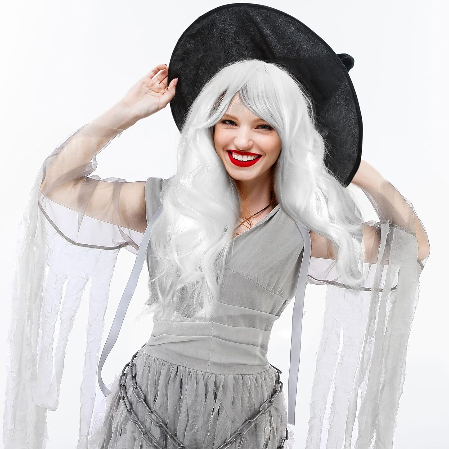 Features: The Halloween women ghost costume (with waist chain) and white hair wig set is suitable for a wide range of occasions. Whether it's a costume party or haunted house visit, this versatile costume set will ensure you get everyone's attention with your spooky and elegant presence. The scary costume for women is designed to make you look mysteriously beautiful. This costume set allows you to unleash your Halloween creativity and stand out from the crowd. Specifications: Material: Haunting beauty costume: polyester Cosplay white wig: synthetic fiber Color: gray, white Size: Small, Medium or X-Large for you to choose Package includes: 1 x Haunting beauty costume 1 x Cosplay white wig Notes: Manual measurement, please allow slight errors on size. The color may exist a slight difference due to different screen displays.