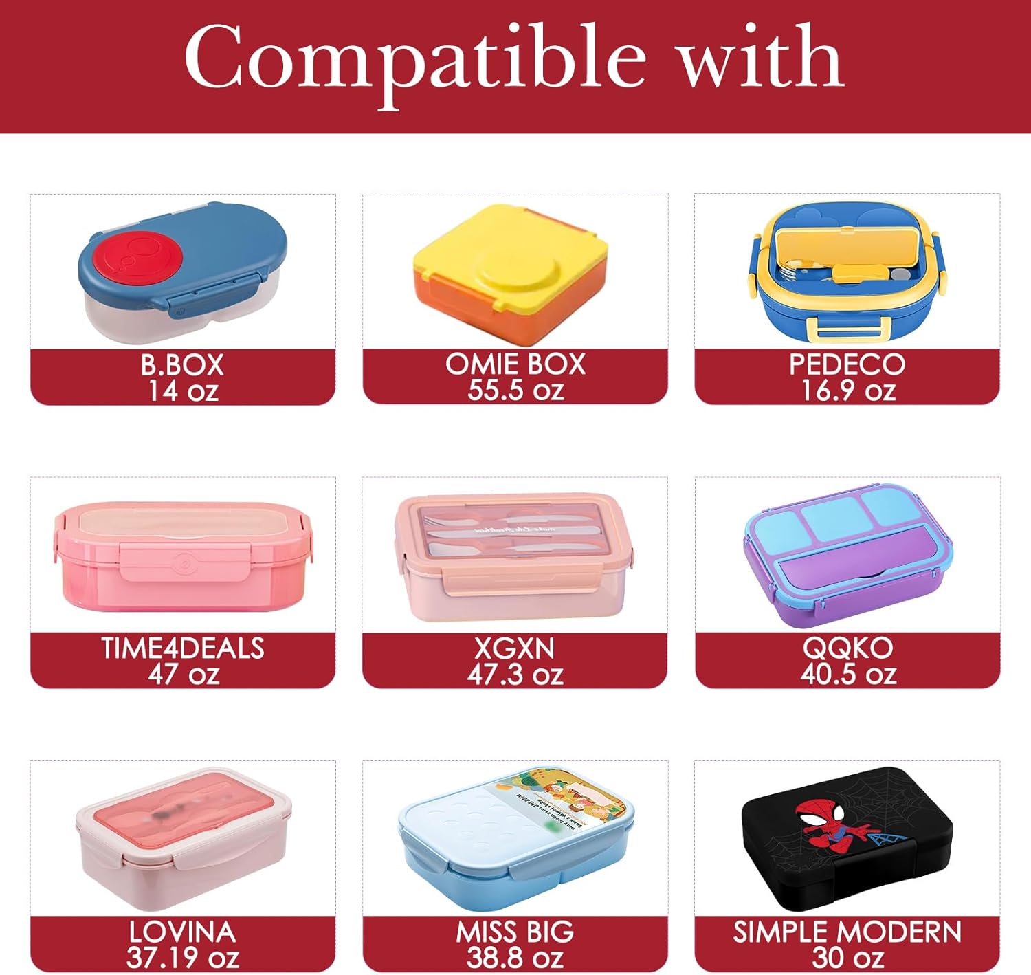 Product Specification: Material:60%Weaving + 40%EVA Color:Red Dimension:9.8'' x 9.8'' x 3.7''(25cm x 25cm x 9.5cm) Items Number:1 Compatible With: - Compatible with OmieBox Lunch Box. - Compatible with OmieBox UP Lunch Box. - Compatible with B.Box 14Oz Lunch Box - Compatible with Sunhanny 40.5Oz Lunch Box - Compatible with Pedeco 16.9Oz Lunch Box - Compatible with Time4deals 47Oz Lunch Box - Compatible with Xgxn 47.3Oz Lunch Box - Compatible with QQKO 40.5Oz Lunch Box - Compatible with Lovina 37.19Oz Lunch Box - Compatible with Miss Big 38.8Oz Lunch Box - Compatible with Simple Modern 30Oz Lunch Box - Compatible with QQKO Bento Lunch Box. Features: - Nice storage accessories for lunch box. Notes: - Lunch box bag only, others are not included.