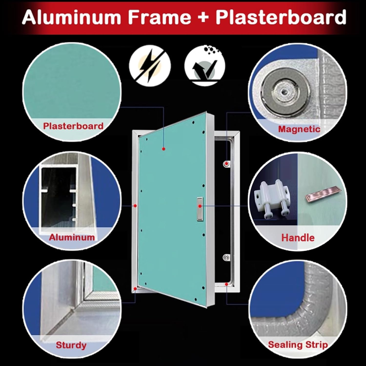 Access Door for Walls & Ceilings Are you still struggling with how to skillfully deal with these unsightly and inconvenient openings?Don't hesitate to choose our built-in access panels, which will all your problems.● Package Includes:1 × Access Panel Door (Including Screws) ● Specification:- Material: Aluminium + Plasterboard- Door Opening Mode: Single/ Double open (outside open, not inside open)- Size: 1. Frame Width: 20 MM (4/5 Inch)2. Total Frame Thickness: 4.1 CM (1 3/5 Inch)3. Outer Frame Thickness: 29 MM (1 1/9 Inch)4. Inner Frame Height: 12 MM ( 1/2 Inch)5. Hole Depth Reservation ≥ 50 mm (2 in)6. Width x Length (Customizable)- Surface: Paintable or Wallpaper● Features: 1. Easy to Install/ Open/ Close.2. Hide Unsightly Openings.3. Can be painted or wallpapered.4. The size in the options is the Outer Diameter Size.5. Even in demanding indoors bathroom.6. Suitable residential/ commercial/ industrial setting. 7. Equipped with a lock and key. (left or right opening options)8. Fully customizable to fit your specific needs.9. Use: Pipe wells/ water meter boxes/ fire hydrants/ power distribution boxes/ fire doors/ maintenance doors.● Warm Tips:1. Manual measurement is recommended. Please allow for a small margin of error (1-2 mm). 2. Select the outer diameter size that matches your hole dimensions for a perfect fit. 3. Specify whether you need a left-opening or right-opening lock during the ordering process. 4. The size in the options is the Outer Diameter Size. Please measure your hole carefully before ordering.)