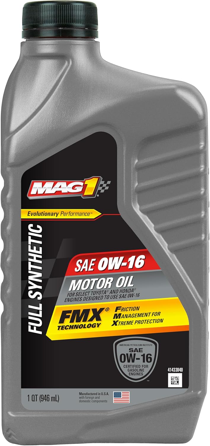 MAG 1® Full Synthetic 0W-16 Motor Oil is our purest and most advanced formulation. It delivers unsurpassed protection and performance. Engineered to improve fuel mileage and to maximize horsepower and acceleration. Longer and better engine protection than conventional oils due to strong and uniform synthetic base oils and advanced molecules that provide a strong film barrier to control friction, resist wear and keep metal surfaces from coming into contact.